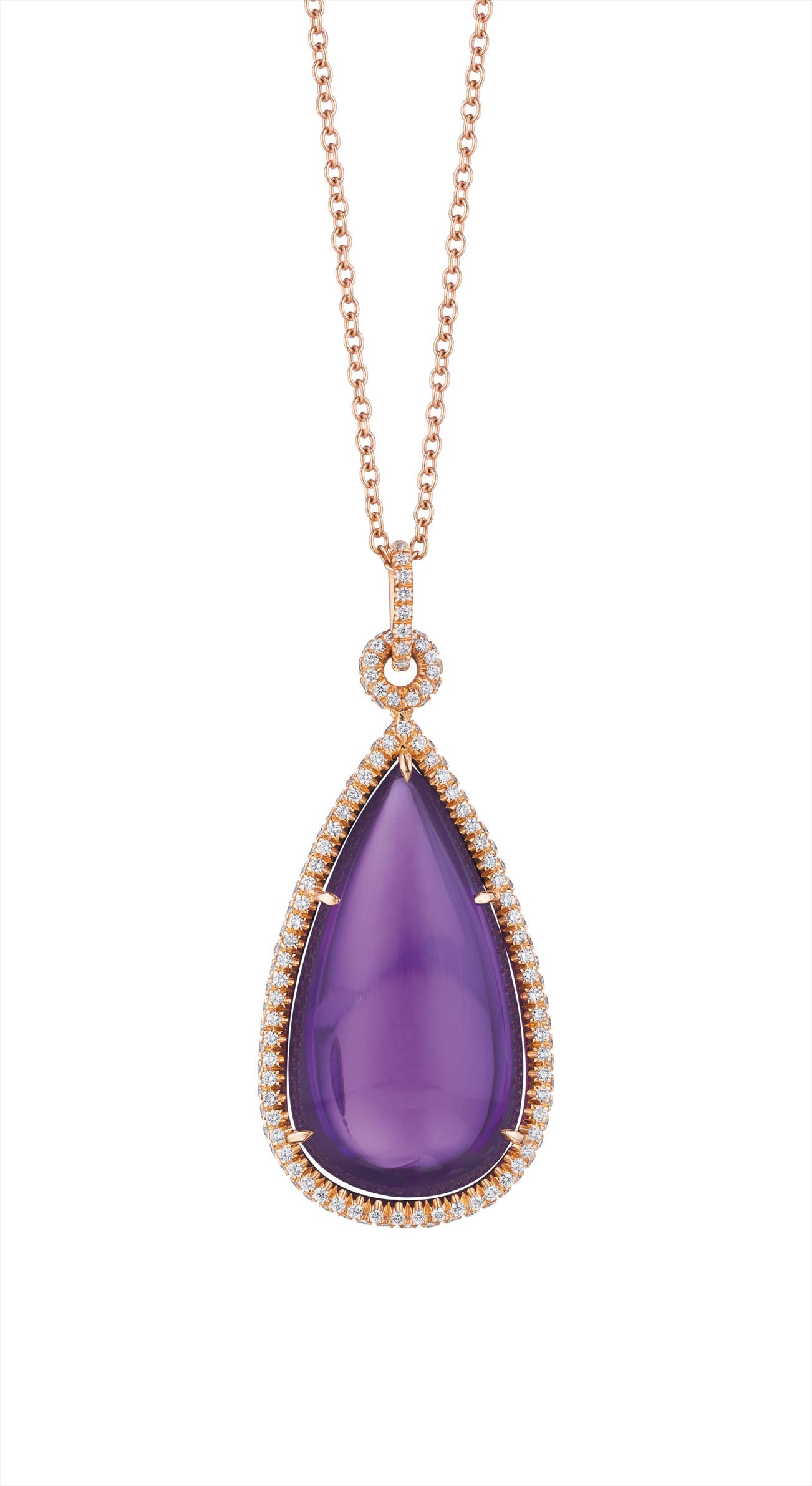 Suspending a pear-shaped cabochon amethyst, weighing approximately 49.66 carats, within a pavé-set diamond surround and bail, from a fine link chain, mounted in 18K rose gold, length 29 inches, pendant length 2 inches.