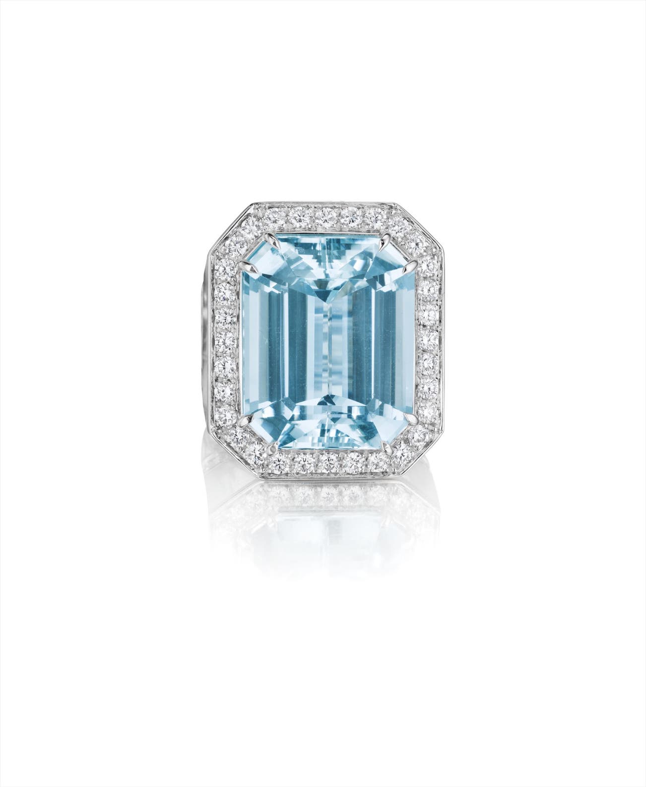 Centering upon a rectangular-cut aquamarine weighing approximately 24.33 carats, within a circular-cut diamond surround, enhanced by a rock crystal gallery and circular-cut diamond detail, mounted in 18K white gold, size 7 3/4.