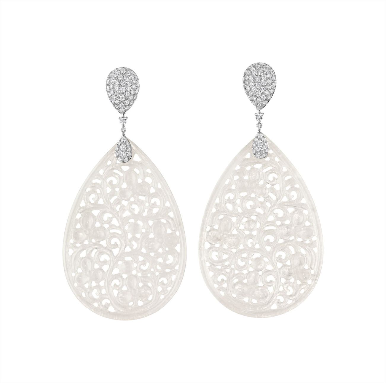 Each suspending a carved pear-shaped jade plaque, from a pavé-set diamond link, to a pear-shaped pavé-set diamond surmount, mounted in 18K white gold, length 3 1/8 inches, pendant is detachable.