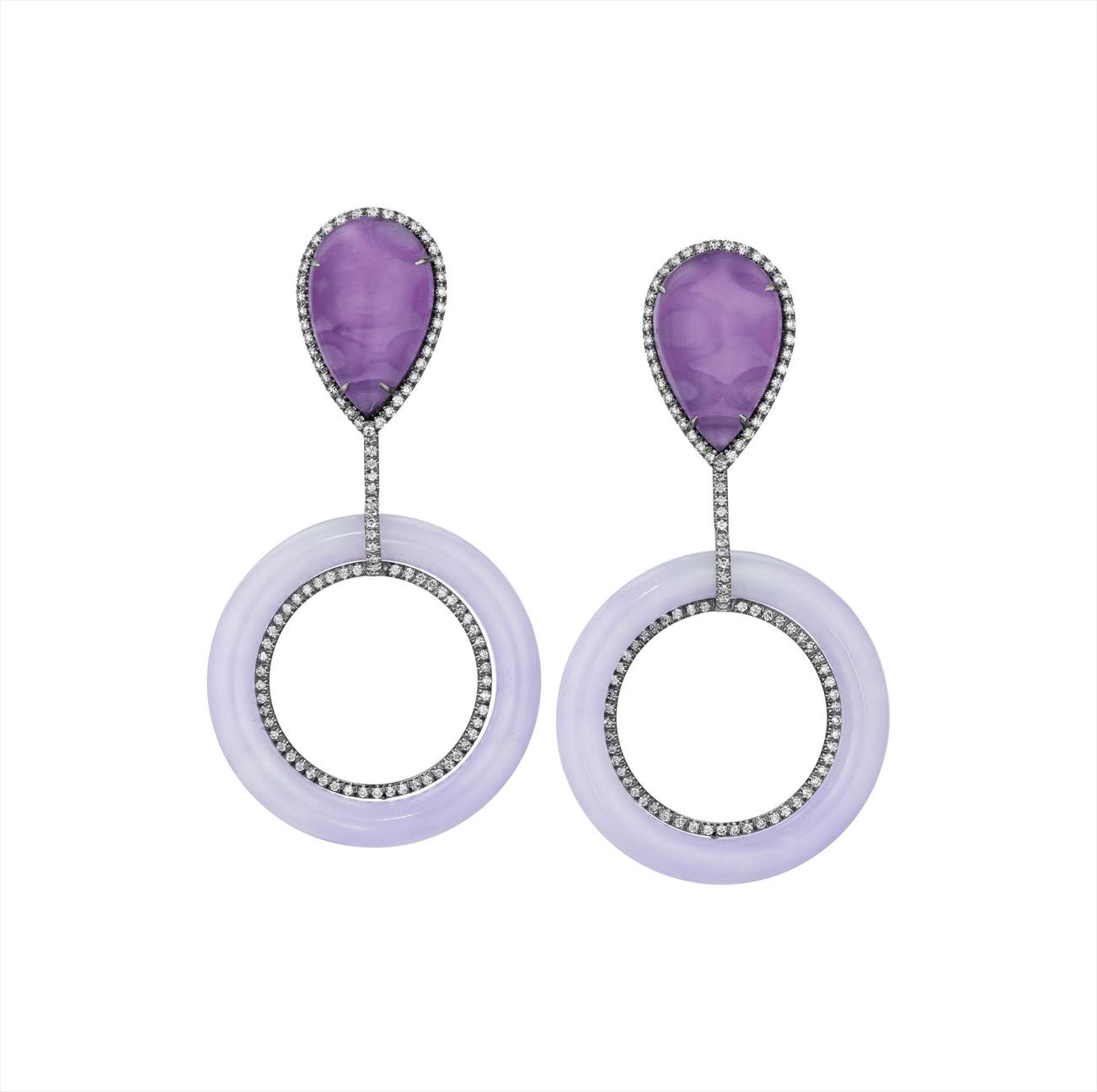 Each designed as a pear-shaped cabochon amethyst surmount, within a circular-cut diamond surround, suspending a freely-moving lavender jade ring, to a pavé-set diamond inner ring and line, mounted in 18K white gold, length 2 1/2 inches.