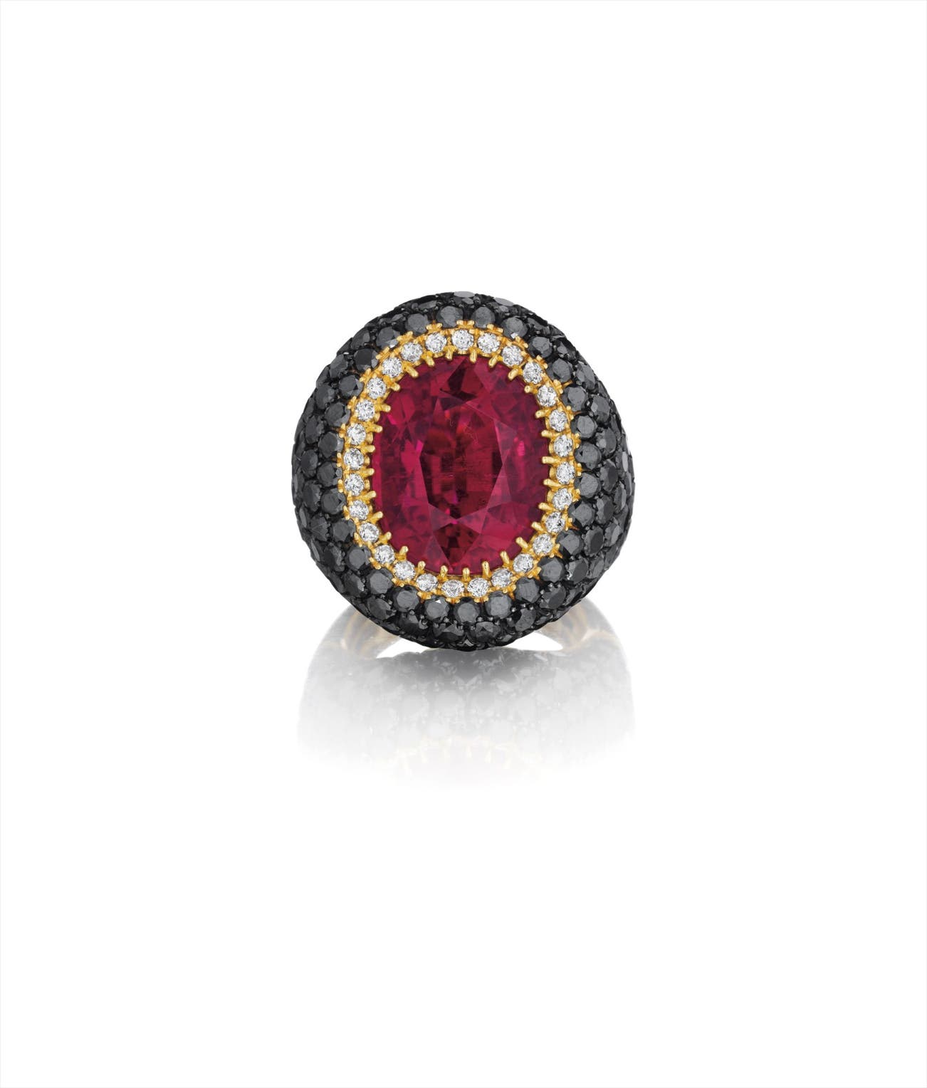Set with an oval-cut rubellite, weighing approximately 10.63 carats, within a circular-cut diamond surround, to the pavé-set black diamond gallery, mounted in 18K yellow gold, size 6.