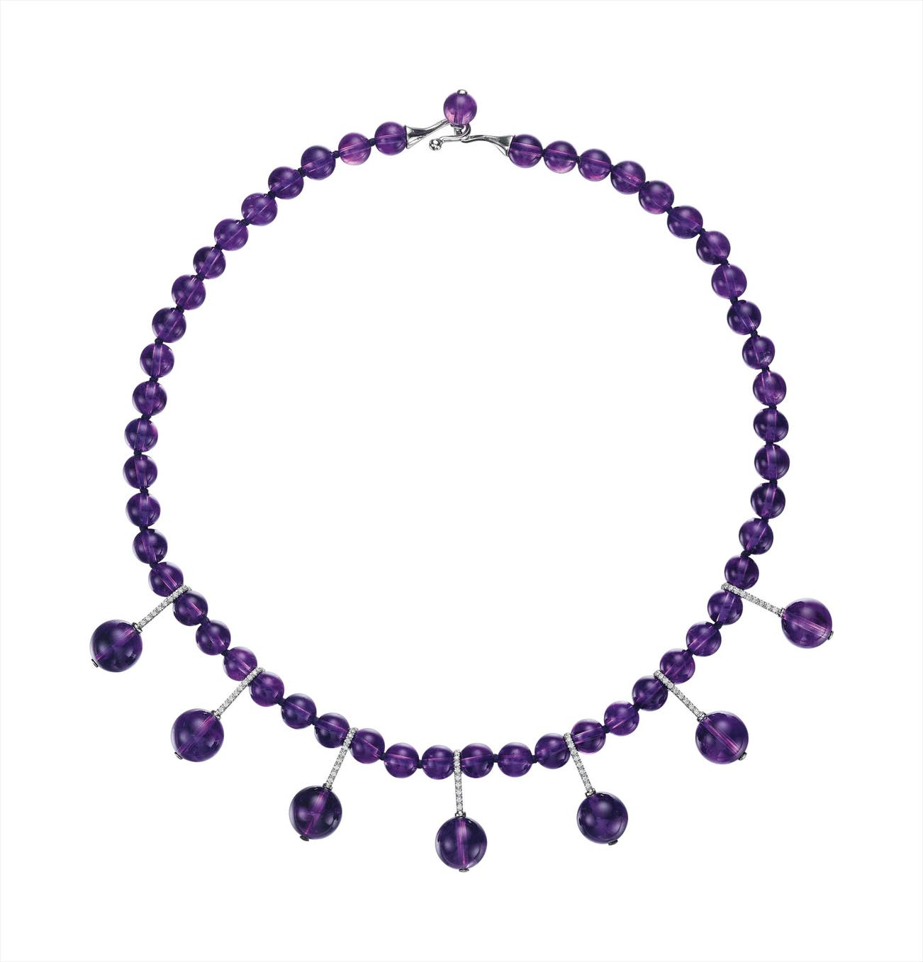Designed as an amethyst bead line, the front suspending seven pavé-set diamond links with amethyst bead terminals, mounted in 18K white gold, length 18 inches.