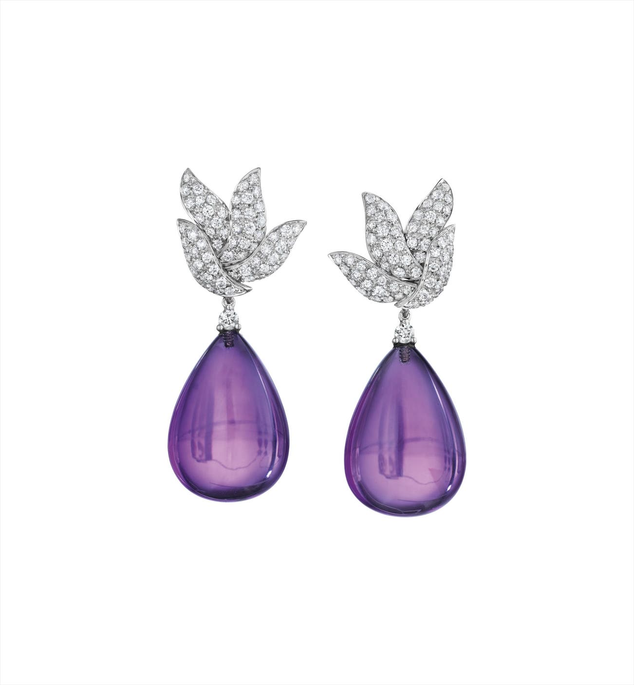 Each pavé-set diamond surmount of sculpted foliate design, suspending a detachable pear-shaped amethyst, weighing approximately 42.85 carats in total, mounted in 18K white gold, length 1 3/4 inches.