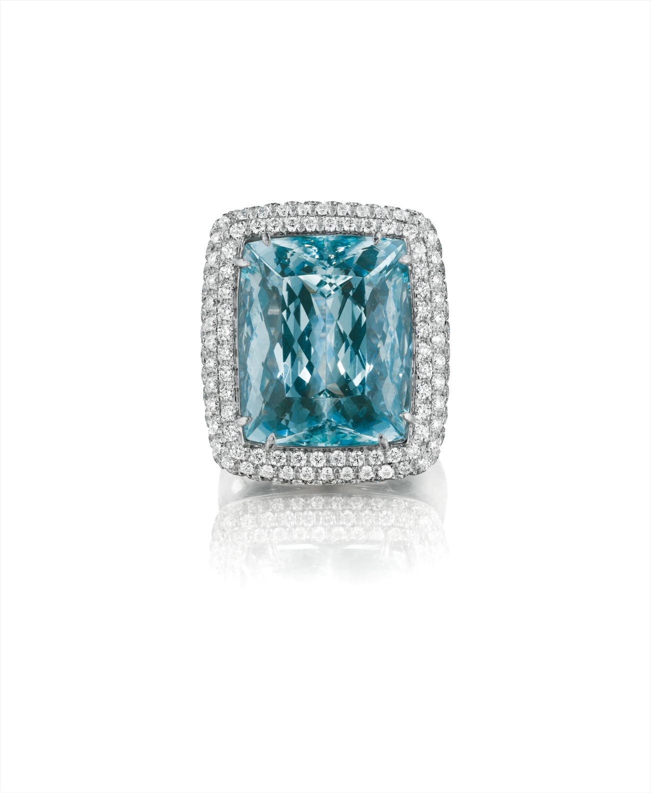 Centering upon a rectangular-cut aquamarine weighing approximately 30.94 carats, within a circular-cut diamond surround, mounted in 18K white gold, size 7.