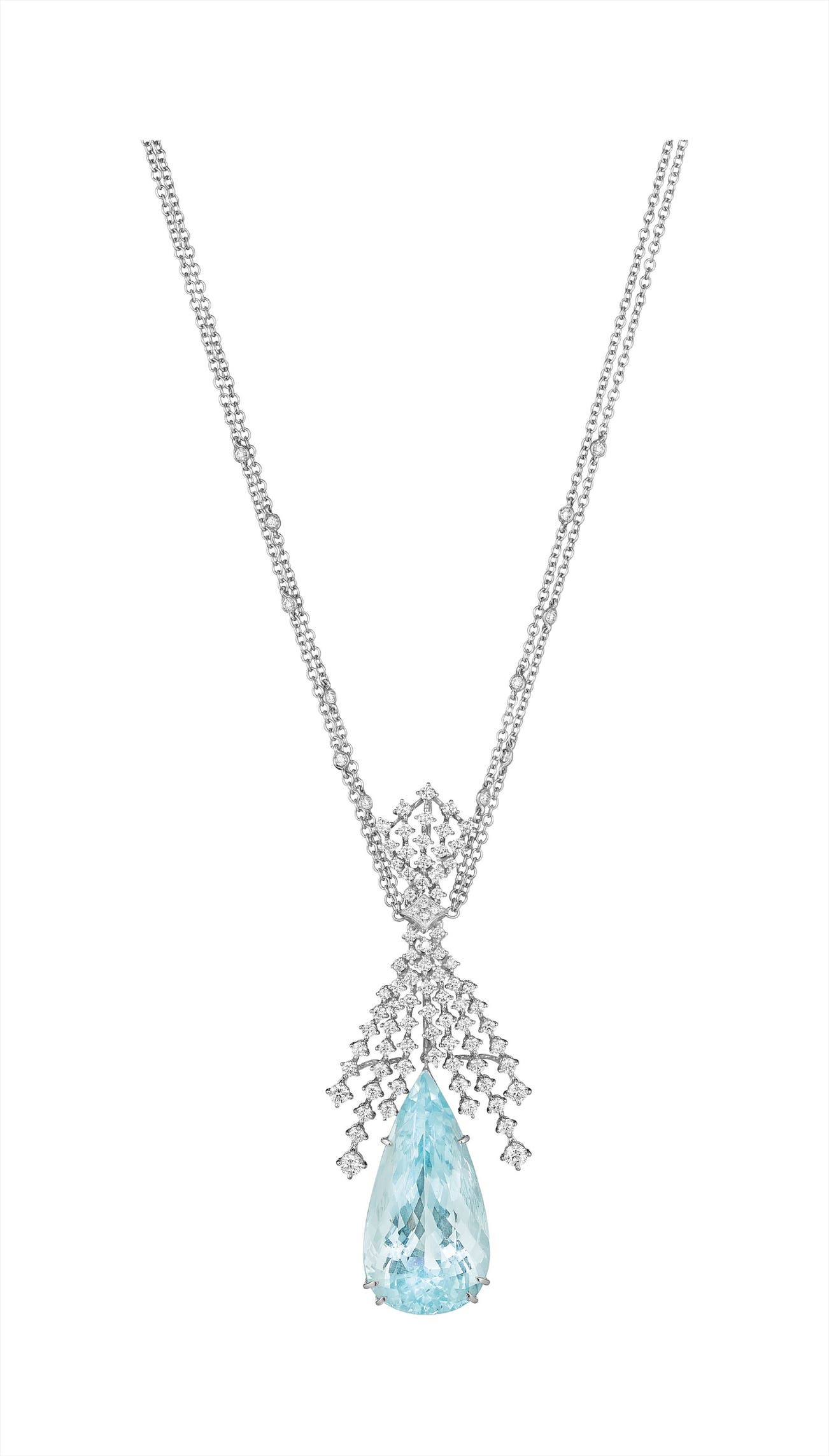 Suspending a pear-shaped aquamarine, weighing approximately 46.78 carats, from a circular-cut diamond spray surmount, to the fine link chain accented by collet-set diamonds, mounted in 18K white gold, length 16 1/2 inches, pendant length 2 3/4 inches.