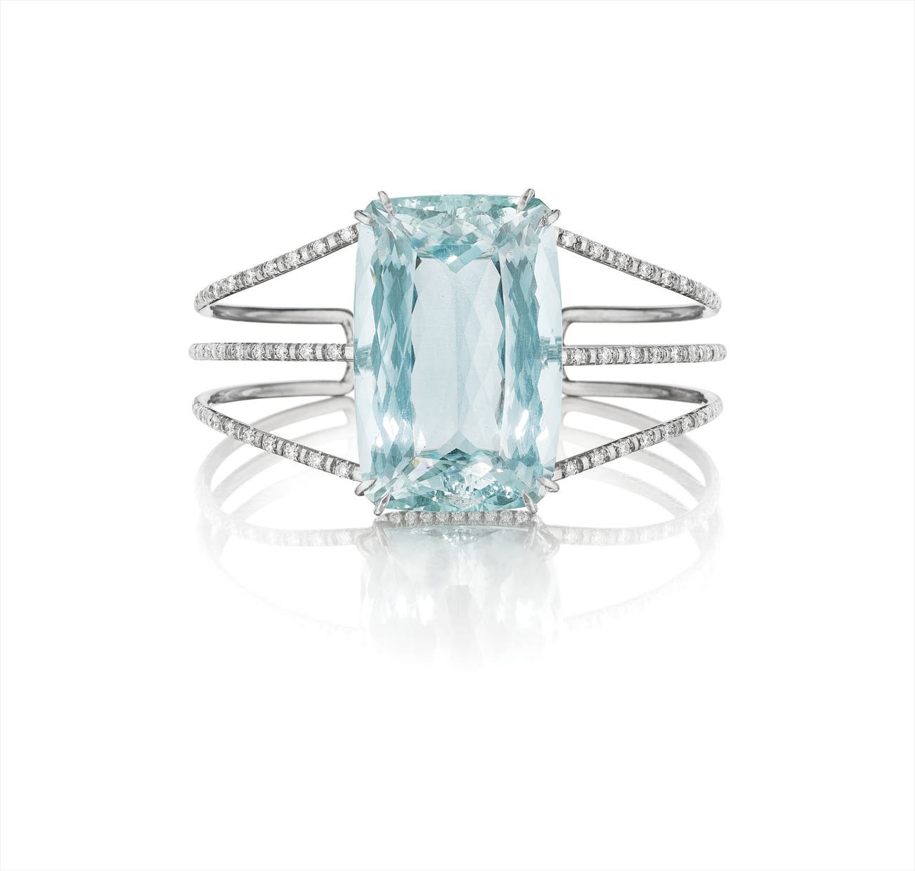 Set to the top with a rectangular-cut aquamarine weighing approximately 67.43 carats, to the three band circular-cut diamond cuff, mounted in titanium, diameter 2 1/8 inches.