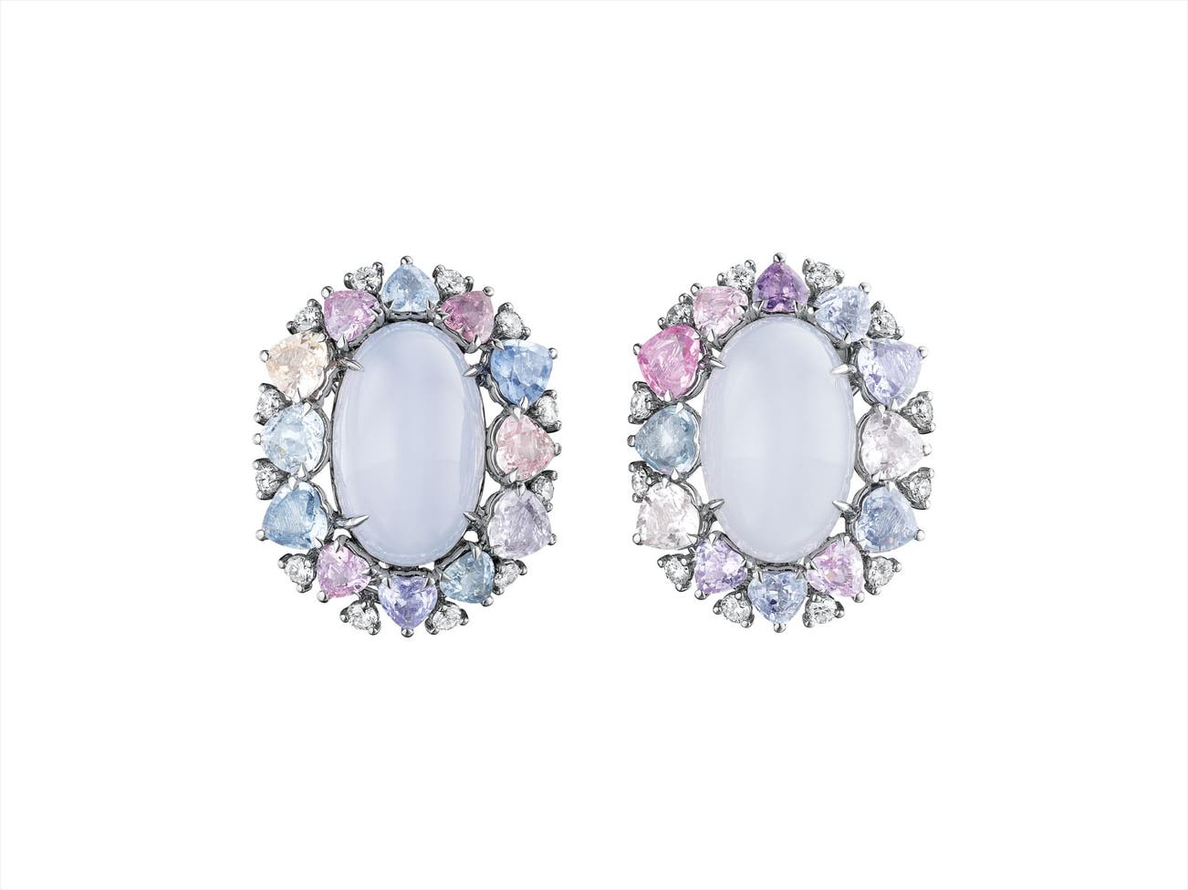 A Pair of Chalcedony, Multi-Color Sapphire and Diamond Earclips