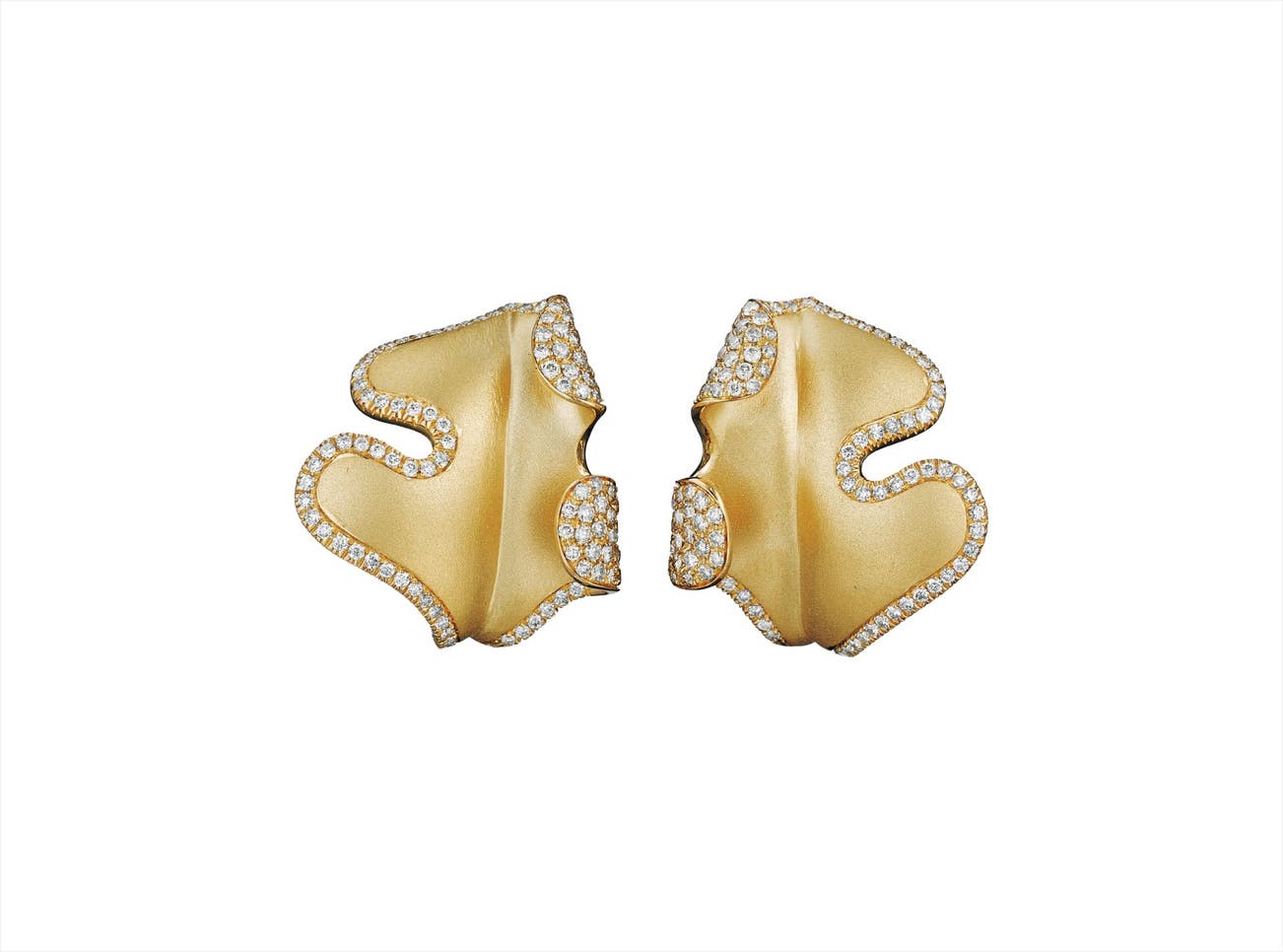 Each designed as a sculpted gold leaf, accented by pavé-set diamond and colored diamond trim, mounted in 18K yellow gold, length 1 inch.