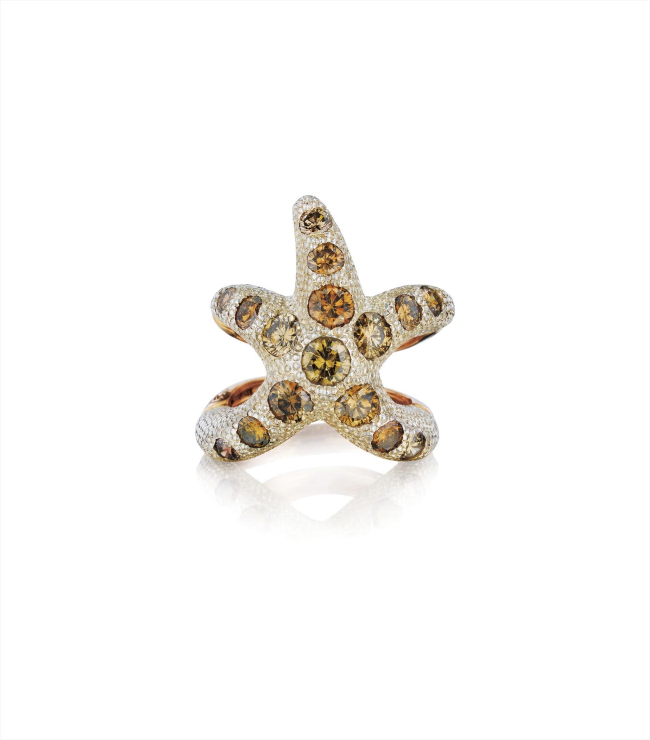 Designed as a starfish, set to the top with circular-cut colored diamonds, to the polished gold hoop, mounted in 18K rose gold and silver, size 7 1/4.