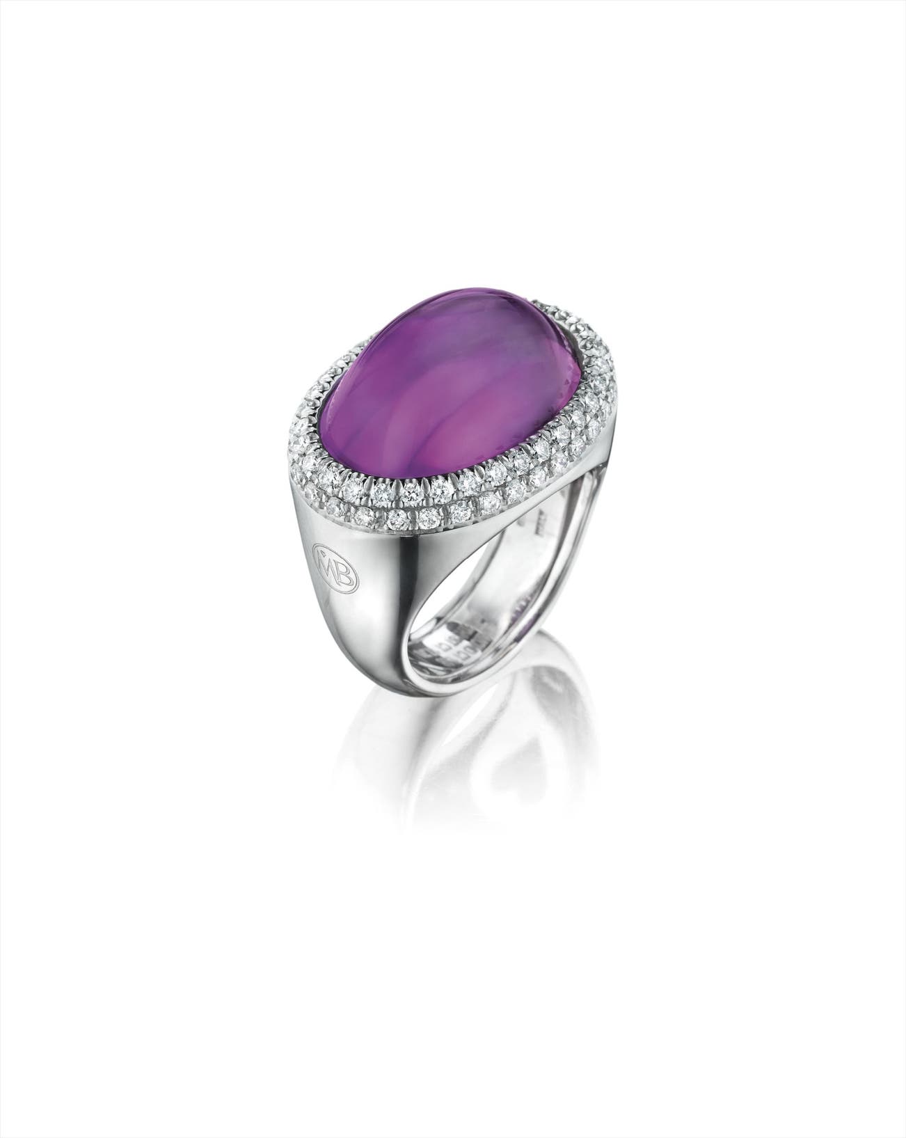 Set with a cabochon amethyst, weighing approximately 17.70 carats, within a pavé-set diamond surround, mounted in 18K white gold, size 6 1/2.