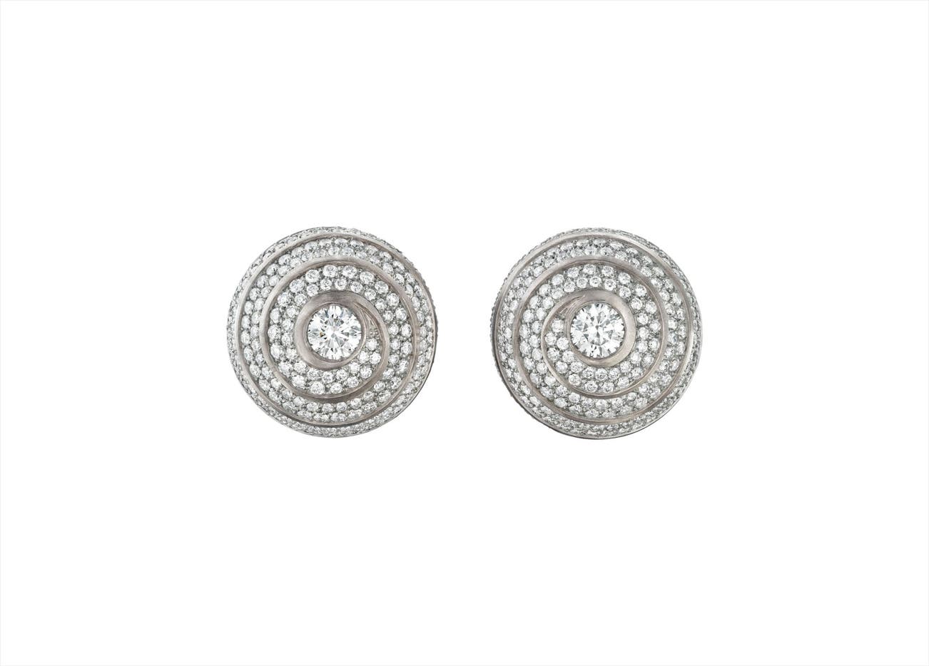 Each designed as a circular bombé plaque, enhanced by a swirl motif of pavé-set diamonds, centering on a circular-cut diamond, mounted in titanium and 18K rose gold, length 3/4 inch.