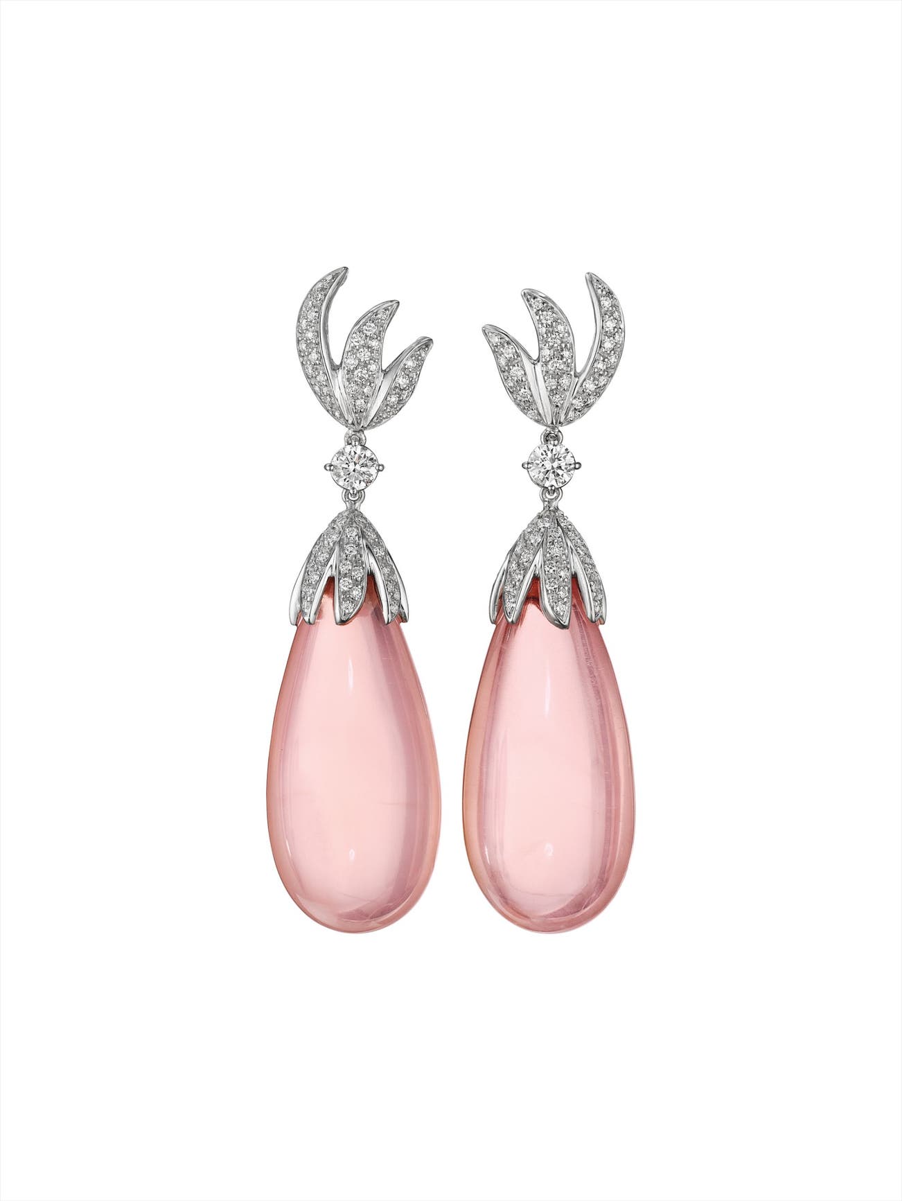 Each suspending a pink quartz drop from a circular-cut diamond foliate cap, to the circular-cut diamond link and similarly designed surmount, mounted in 18K white gold, length 2 inches.