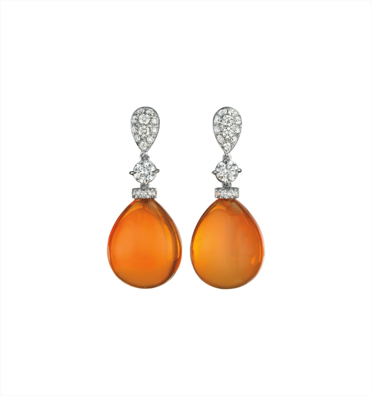 Each suspending a pear-shaped cabochon fire opal drop from a circular-cut diamond link, to the pavé-set diamond surmount, mounted in 18K white gold, length 1 1/3 inches.