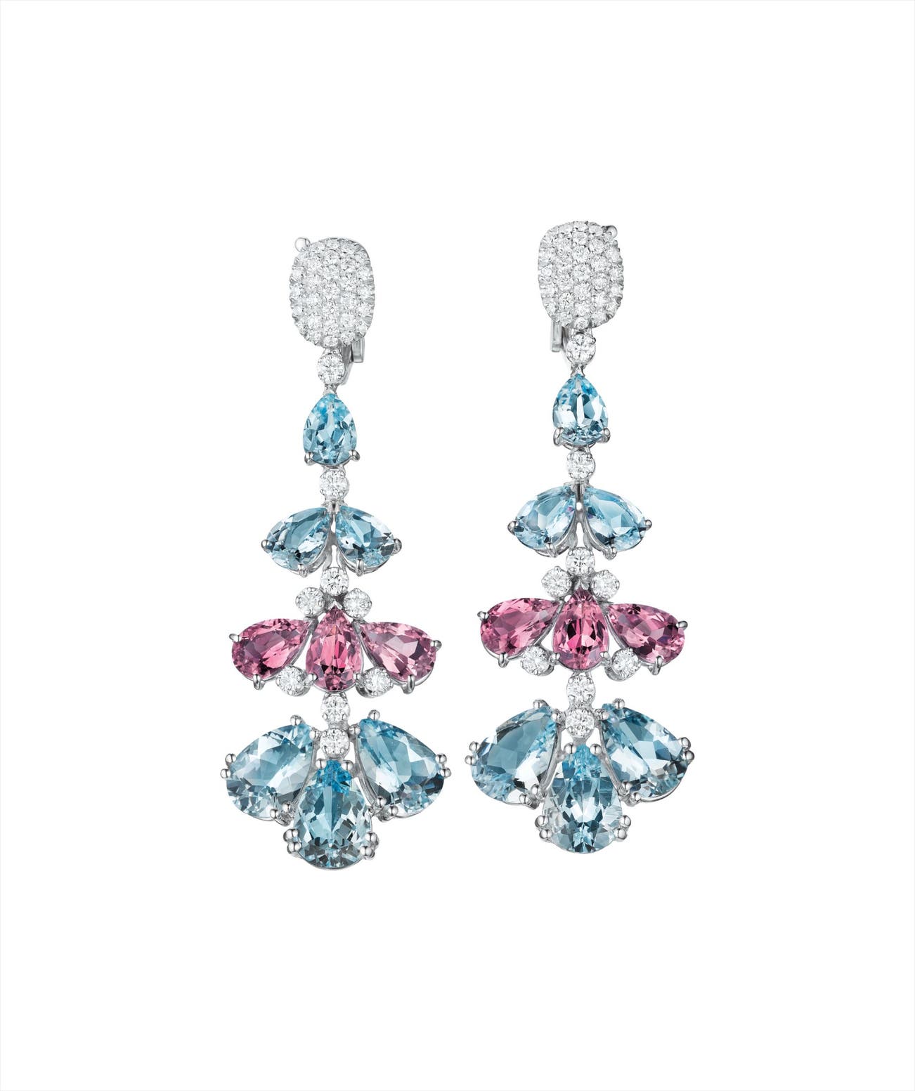 Each designed as a graduating line of pear-shape aquamarine and pink tourmaline tiers, enhanced by circular-cut diamonds, suspended from a pavé-set diamond surmount, mounted in 18K white gold, length 2 3/8 inches.