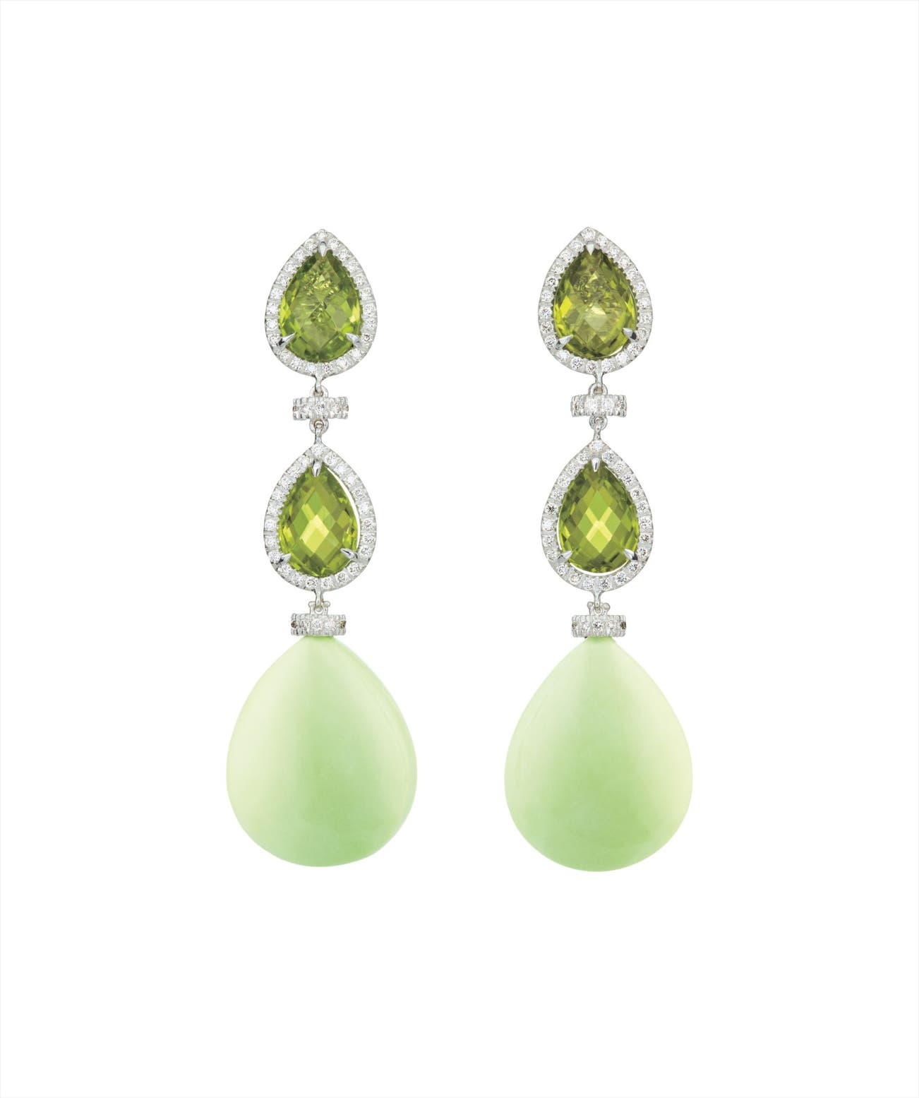 Each designed as a line of two pear-shape peridot within pavé-set diamond surrounds, interspersed by circular-cut diamond spacer links, suspending a magnesite drop, mounted in 18K white gold, length 2 1/4 inches.