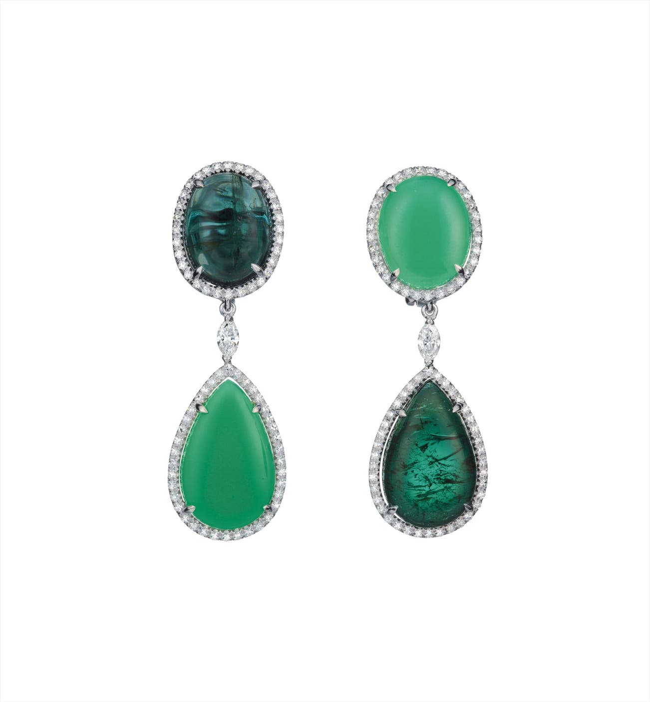Each designed as an opposing detachable cabochon chrysoprase or tourmaline drop within a pavé-set diamond surround, suspended from a marquise-cut diamond link and similarly designed surmount, mounted in 18K white gold, length 1 7/8 inches.