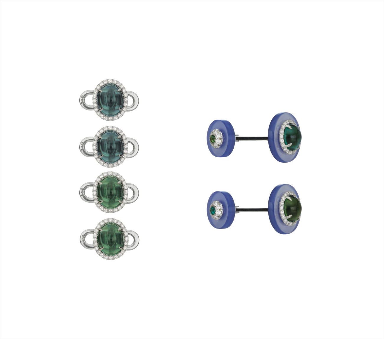 Comprising a pair of cufflinks, each set with a circular chalcedony plaque centrally set with a cabochon tourmaline within a circular-cut diamond surround, to the similarly designed swivel link; four shirt studs en suite, mounted in 18K white gold, cufflink length 3/8 inch, shirt stud length 1/2 inch.