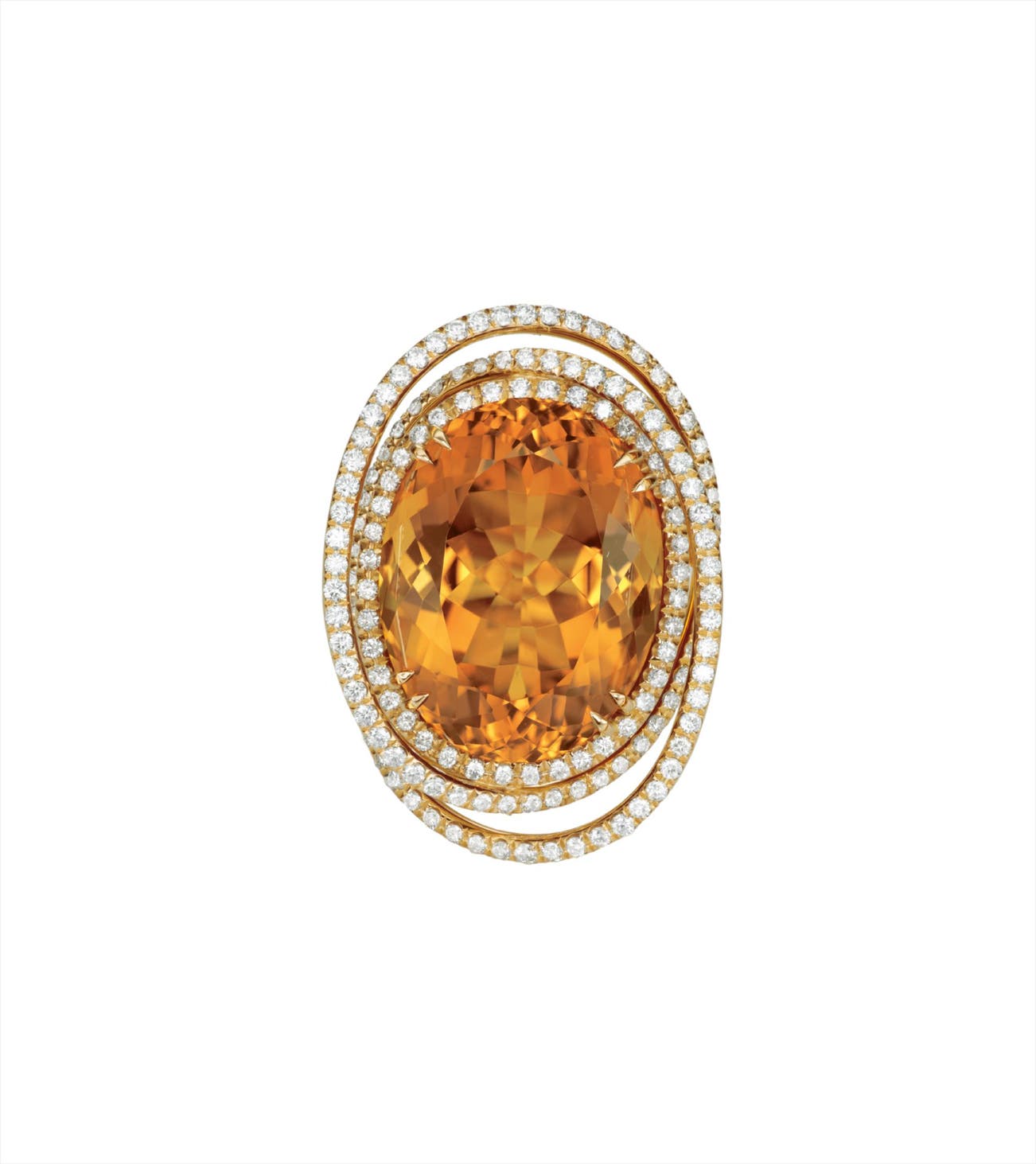 Centering upon an oval-cut citrine, weighing approximately 35.53 carats, within a circular-cut diamond spiral surround and gallery, to the split shoulders and hoop, mounted in 18K yellow gold, size 8.