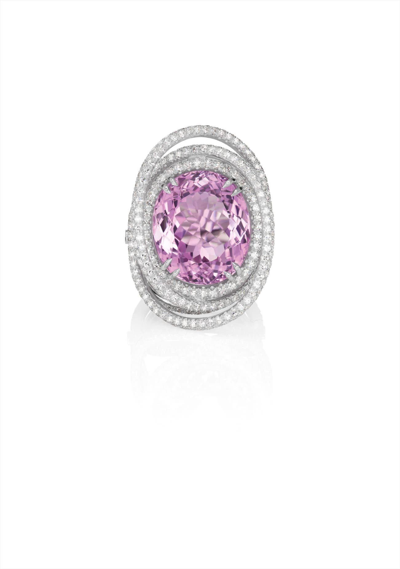 Centering upon an oval-cut kunzite, weighing approximately 22.03 carats, within a circular-cut diamond spiral surround and gallery, to the split shoulders and hoop, mounted in 18K white gold, size 7.