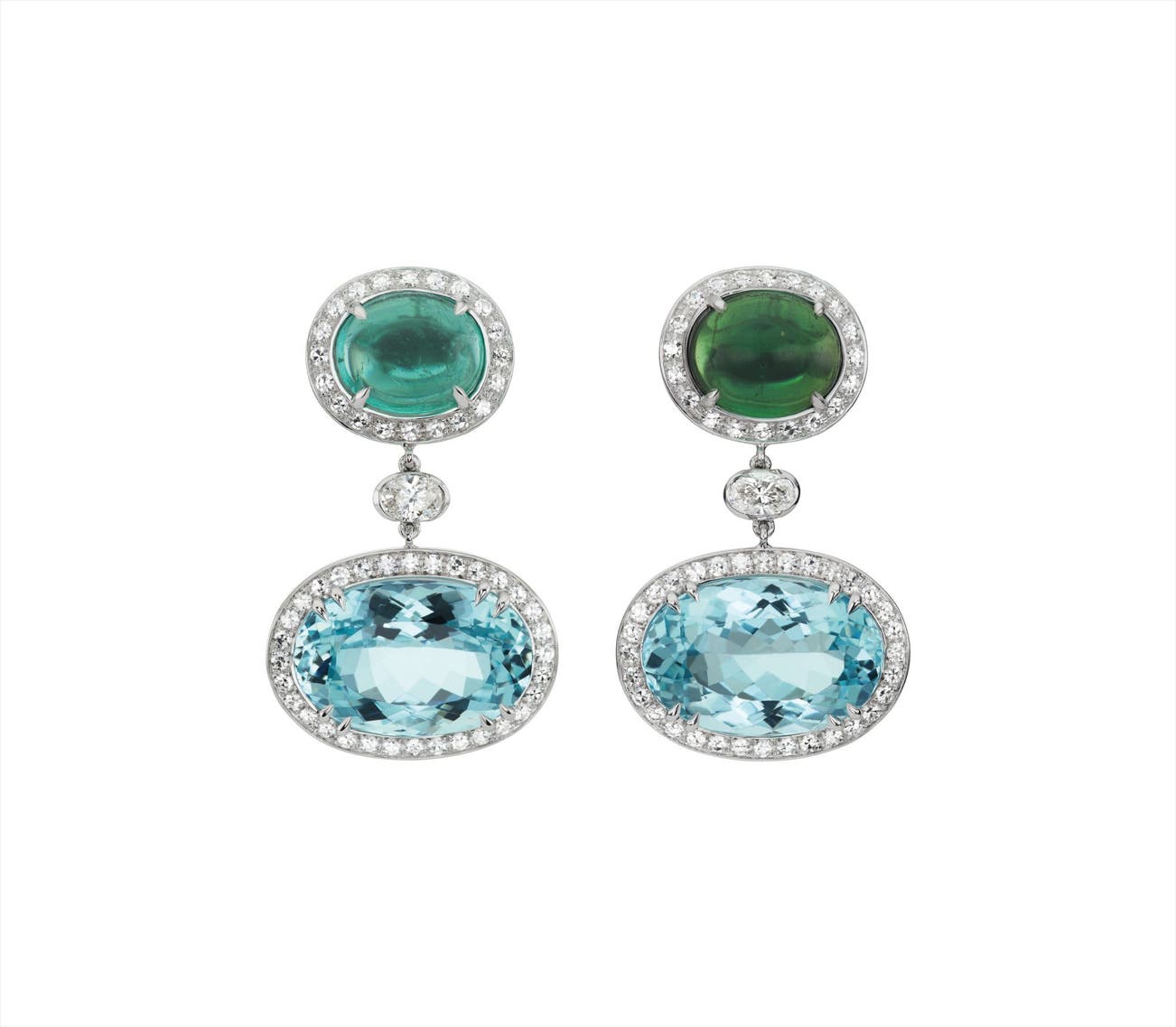 A Pair of Aquamarine, Tourmaline, and Diamond Ear Pendants