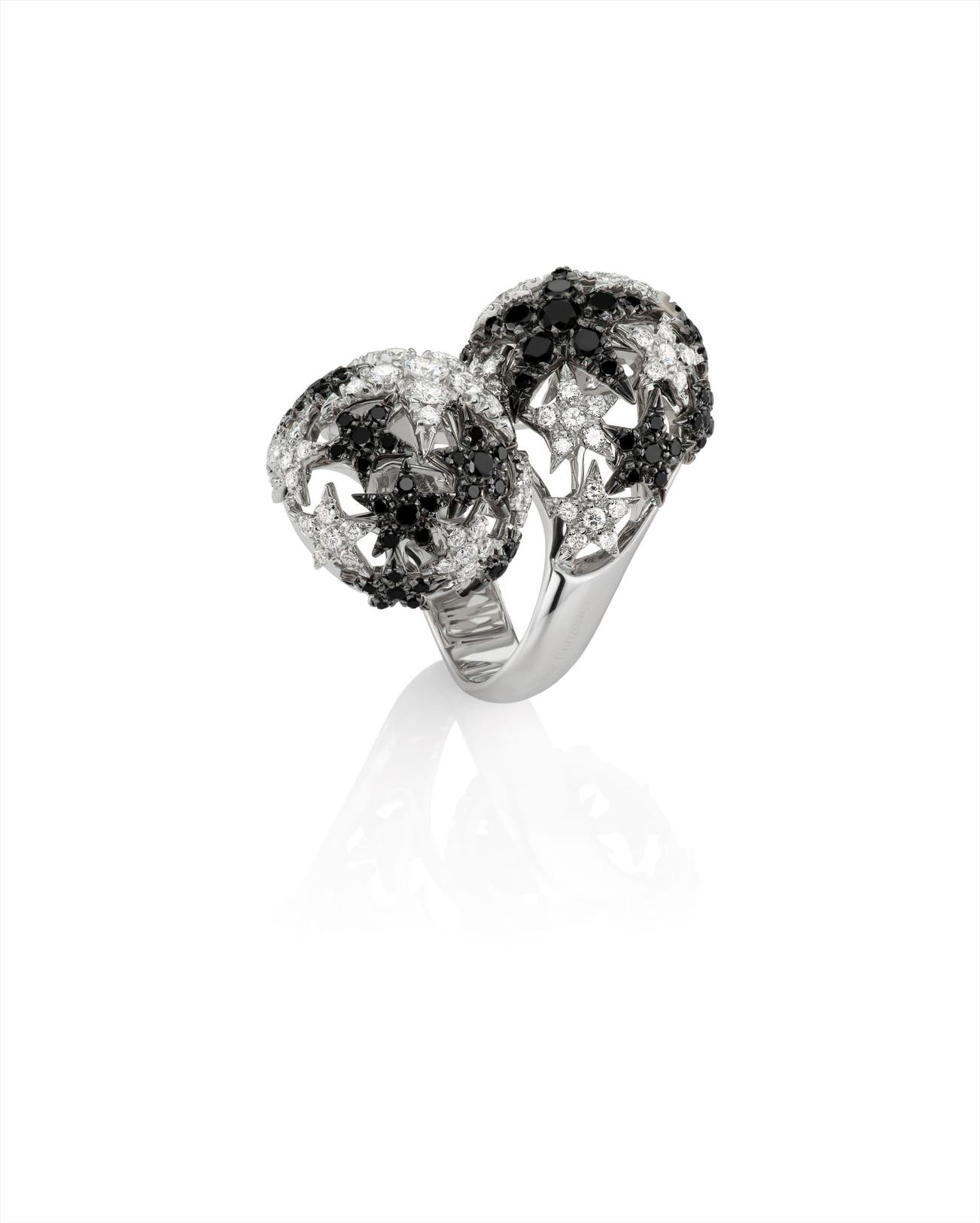 Of cross-over design, each open-work bombé terminal enhanced by star motifs set with circular-cut diamonds and black diamonds, mounted in 18K white gold, size 7.