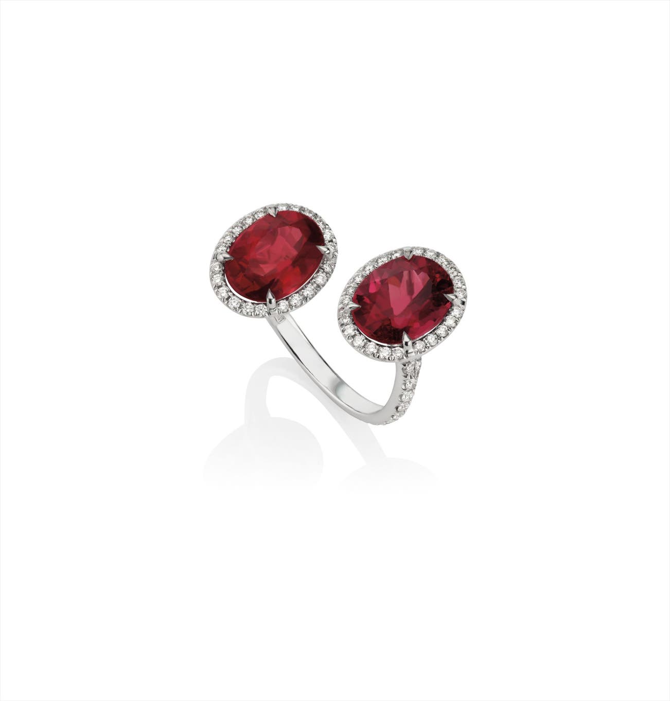 Set with two oval-cut tourmalines within circular-cut diamond surrounds, to the circular-cut diamond galleries and hoop, mounted in 18K white gold, size 6 1/2.