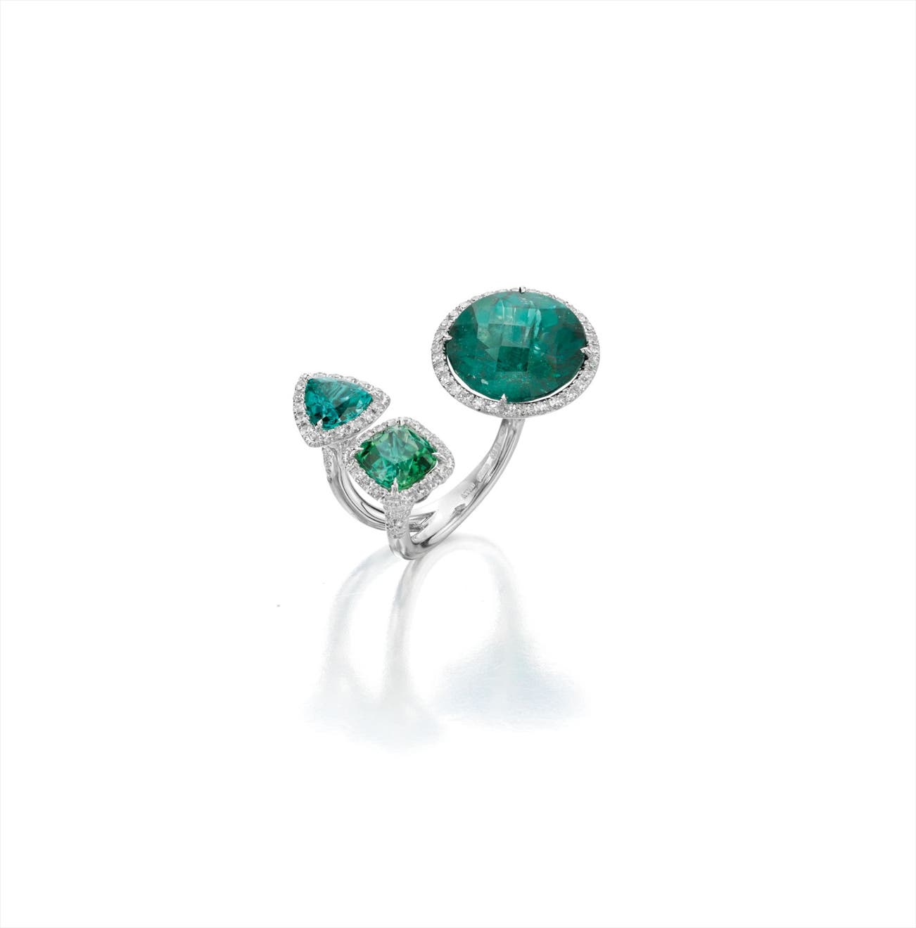 Of asymmetric design, set to the top with three vari-cut tourmalines weighing approximately 13.05 carats in total, enhanced by circular-cut diamond surrounds and galleries, mounted in 18K white gold, size 6 1/4.