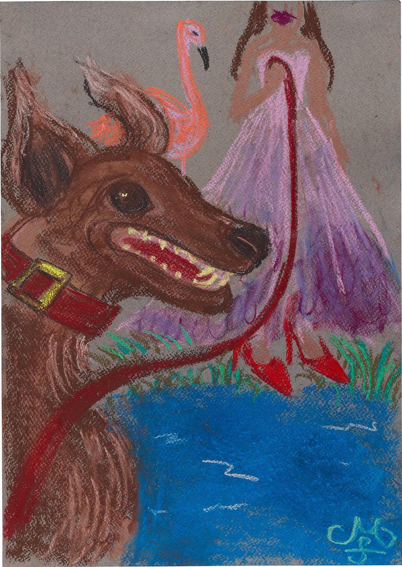 Maria Farrar’s whimsical handling of everyday scenes transports the viewer to an alternate reality of colour and intrigue. Born in the Philippines in 1988, the artist was raised in Japan until the age of 15 when she moved to London – Farrar has observed the subsequent cultural duality in her work, identifying the influence of Japanese Calligraphy and Manga married with a Western use of colour and technique. In Stroll from 2019, Farrar reconstructs the mundane activity of walking ones’ dog with the fairy-tale attributes of a female figure in a flowing ballgown, poised at the edge of a lake and flanked by a flamingo. The close cropping of the image renders the figure anonymous and instead, her red shoes and the wolf-like dog, poised with teeth bared are the protagonists of the scene. The picture is imbued with a sense of elusiveness and through the positioning of the three figures, the narrative of the scene remains just out of reach.