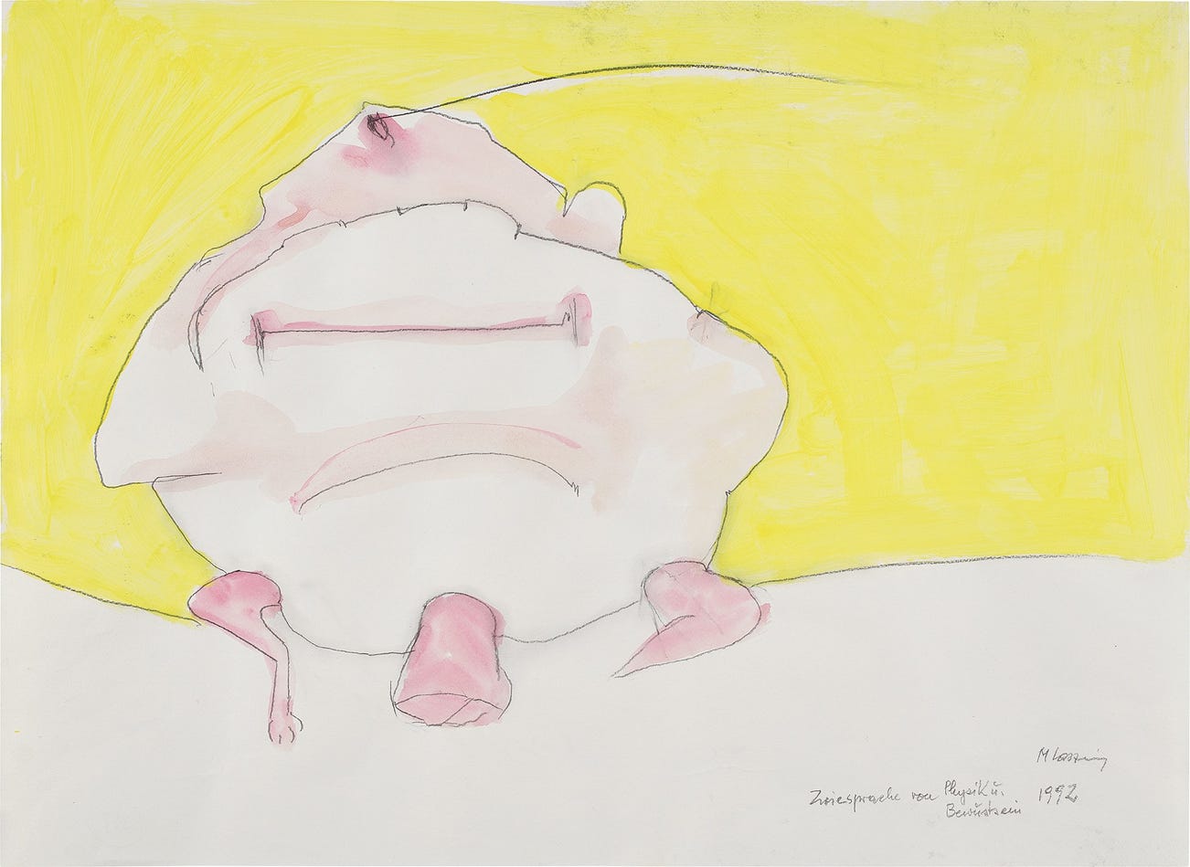 signed, titled and dated "Zwiesprache von Physik u Bewusstsein M Lassnig 1992" lower right; further inscribed "1297" on the reverse