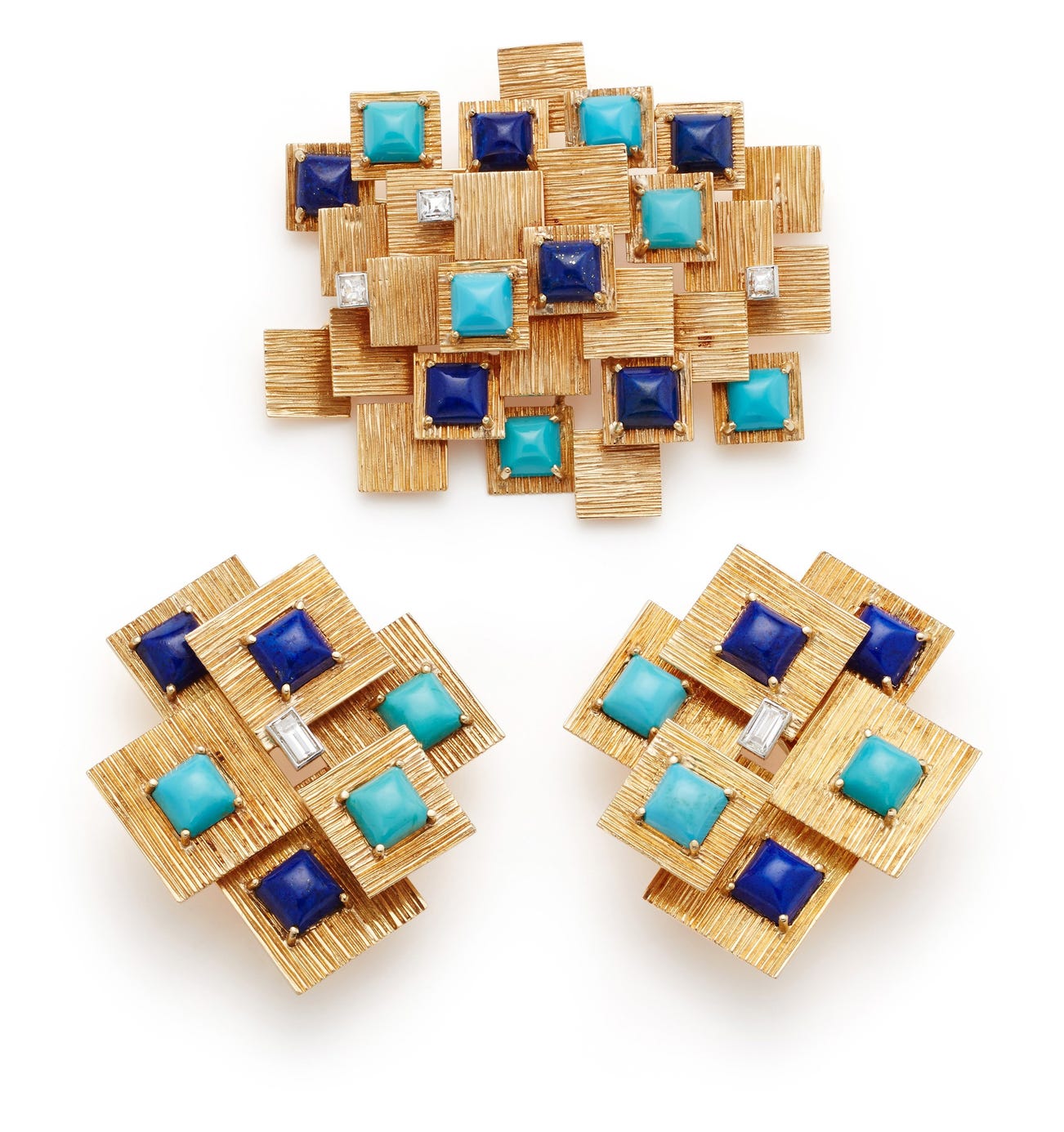 A Pair of Lapis Lazuli, Turquoise, Diamond and Gold Earrings and Brooch