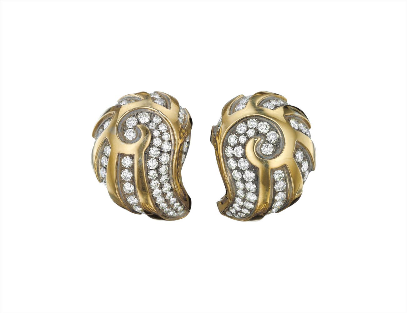Each designed as a bombé teardrop plaque, enhanced by circular-cut diamonds, mounted in 14K yellow gold and silver, length 1 1/4 inches.