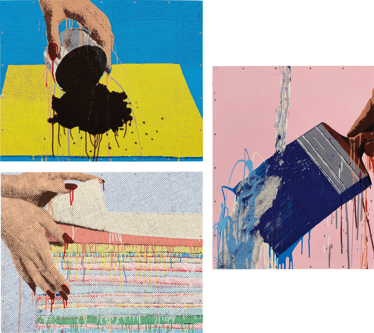 Three screenprints in colors, on aluminum panel mounted to metal strainer (as issued), the full sheets.
