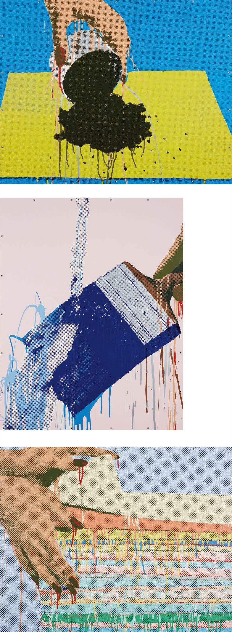 Three screenprints in colors, on aluminum panel mounted to metal strainer (as issued), the full sheets,