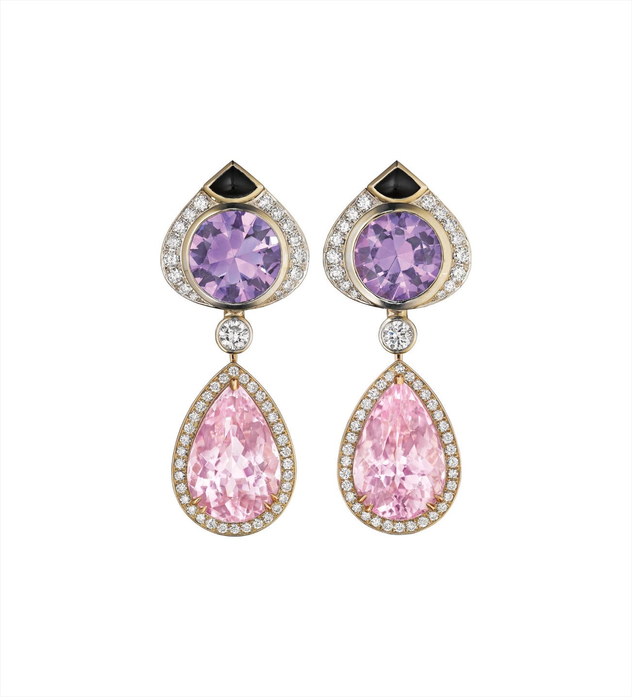 A Pair of Amethyst, Kunzite, Onyx, and Diamond Ear Pendants