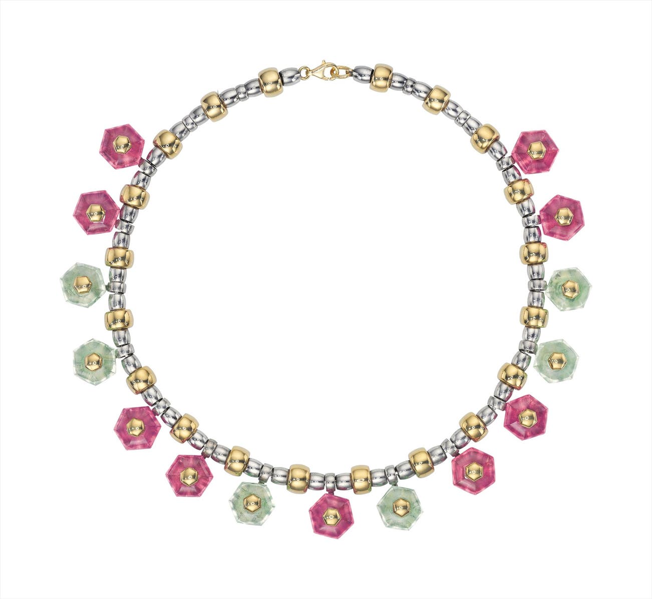 Marina B’s distinctive designs have come to define 1980s style: strong, graphic, highly stylised, yet with a feminine voluptuousness, encapsulated in her early Ondas or wave design, and in her signature motif, described as a ‘chestnut’ shape, curvaceous, flirtatious, poised between a triangle and a pear-shape. The triangle, in various iterations, including triangular-cut diamonds, ran like a leitmotif through her work. A Bulgari to her core, she revelled in coloured gems, particularly fashionable cabochons, but she set them alongside new materials, including black gold, which became one of her most recognisable signatures. She was deeply concerned with the relationship between design and structure, devising a spring-mounting technique for her signature chokers; creating modular jewels, with interchangeable elements, for versatility; and finding innovative ways of connecting beads – she detested the banality of simply stringing beads or pearls. In her hugely successful Pneu earrings, first created in 1978, she transformed the hole at the centre of a bead, the bellybutton as she called it, into a decorative feature, adorning it with a cabochon stone. She used all elements of her powerful visual vocabulary to incorporate stylised references to exotic cultures, Chinese, Japanese, Persian and Byzantine, another link to the jet-set era. Even more, understanding and capturing the mood of the moment, she designed jewels for women to buy for themselves, to suit their clothes, lives and lifestyles. In 1993 she moved to Monaco and retired in 1996. Today, the company continues under the creative direction of Guy Bedarida, in the Marina B spirit.