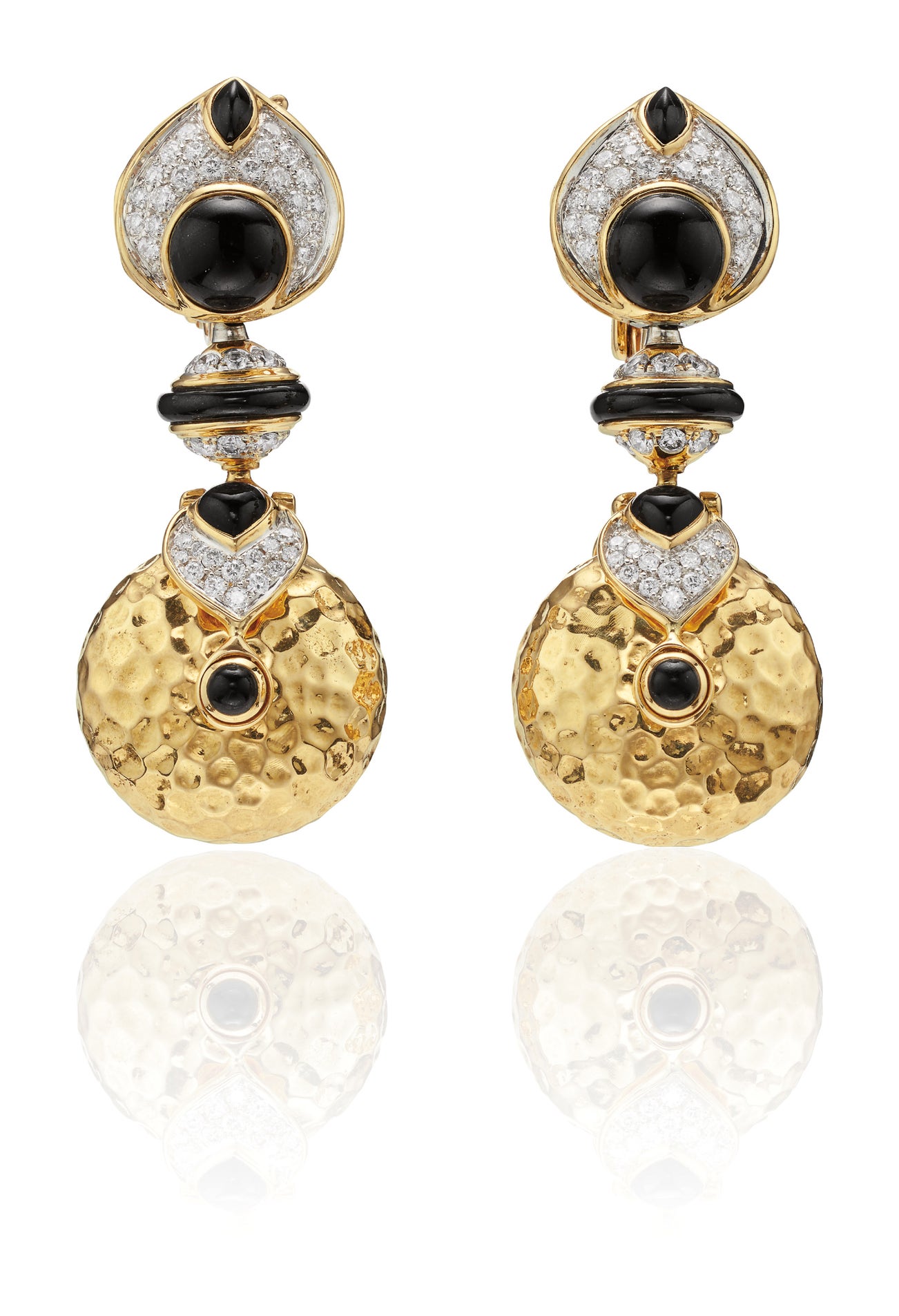 Marina B’s distinctive designs have come to define 1980s style: strong, graphic, highly stylised, yet with a feminine voluptuousness, encapsulated in her early Ondas or wave design, and in her signature motif, described as a ‘chestnut’ shape, curvaceous, flirtatious, poised between a triangle and a pear-shape. The triangle, in various iterations, including triangular-cut diamonds, ran like a leitmotif through her work. A Bulgari to her core, she revelled in coloured gems, particularly fashionable cabochons, but she set them alongside new materials, including black gold, which became one of her most recognisable signatures. She was deeply concerned with the relationship between design and structure, devising a spring-mounting technique for her signature chokers; creating modular jewels, with interchangeable elements, for versatility; and finding innovative ways of connecting beads – she detested the banality of simply stringing beads or pearls. In her hugely successful Pneu earrings, first created in 1978, she transformed the hole at the centre of a bead, the bellybutton as she called it, into a decorative feature, adorning it with a cabochon stone. She used all elements of her powerful visual vocabulary to incorporate stylised references to exotic cultures, Chinese, Japanese, Persian and Byzantine, another link to the jet-set era. Even more, understanding and capturing the mood of the moment, she designed jewels for women to buy for themselves, to suit their clothes, lives and lifestyles. In 1993 she moved to Monaco and retired in 1996. Today, the company continues under the creative direction of Guy Bedarida, in the Marina B spirit.