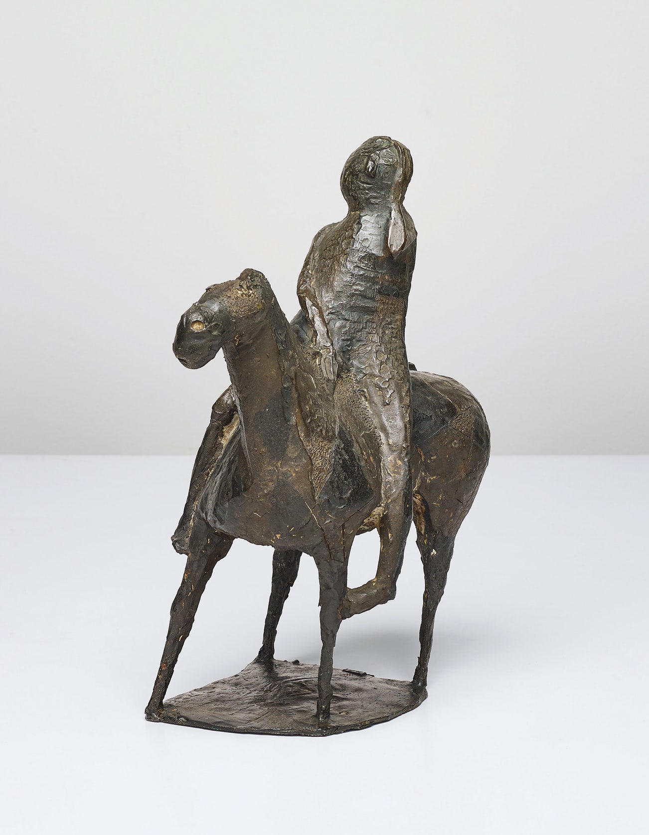 Purchased by Los Angeles collector Betty Sheinbaum from famed art dealer Eric Estorick in 1958 and remaining in the prolific collection until today, Piccolo Cavaliere shows a lone rider sitting precariously on the back of his horse. His slight, rigid frame leans back, one hand crossing his body, clutching for the static horse below him. The dynamic tension between the rider and the horse is palpable. Man as the master of beast is transposed as both rider and horse appear poised, on the edge of some ominous conflict. The horse’s rear legs appear to be on the brink of buckling, ready to jolt the rider from his position of power. Yet, wrought from the same material, the rider and his horse seem fused together in an almost organic, amalgamated entity, unable to truly separate from one another. Here, the sculpture is imbued with psychological complexity as the angularity of the rider’s form jars with the softer, rounder features of the horse below.