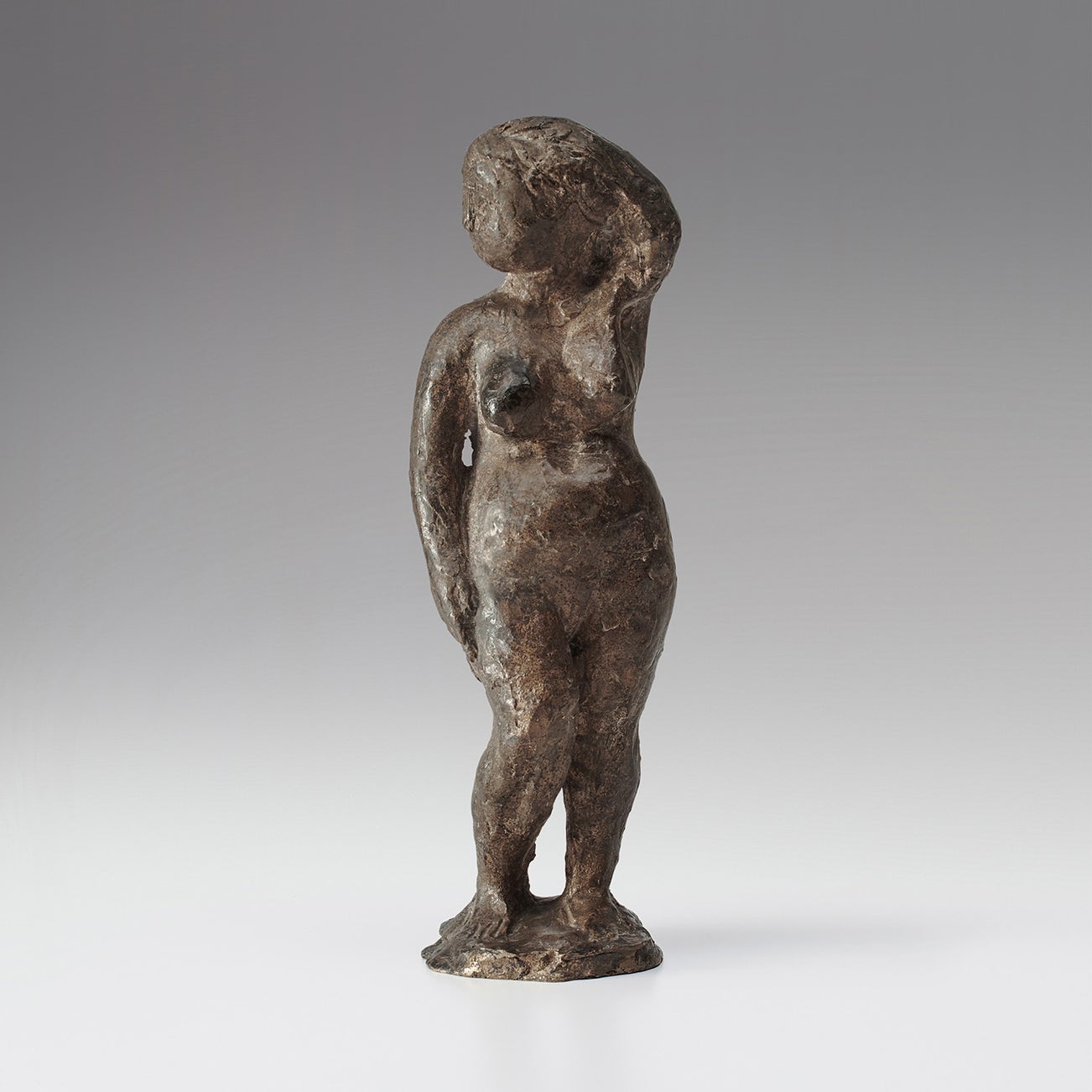 stamped with artist's raised initials "MM" on the top of the base behind figure's feet