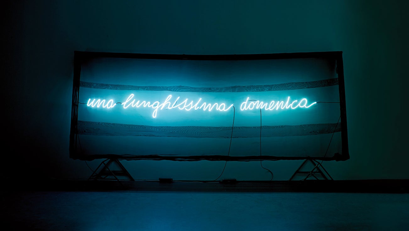 Utilizing visual stimulation to guide the cognitive process, Merz adroitly juxtaposes disparate materials in Una lunghissima domenica: the structured wire mesh and iron supports serve as a contrastingly rigid backdrop for the delicate cursive bands of soft neon displayed in the artist’s handwriting. In this way, the energy of light is contained while remaining impactful and inescapable. The contradiction of these materials emphasizes the artist’s embrace of life’s imbalance and its importance in everyday experience. Favoring the reflection of individual journeys and finding interest in the subjectivity of experience, Una lunghissima domenica inserts itself into the human context and prompts the viewers to deliberate the source of individual associations with language.