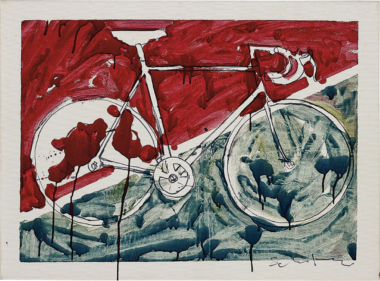 signed 'Schifano' lower right; further signed and inscribed 'X Simoni Schifano QUESTA OPERA PROVIENE DIRETTAMENTE DALL' ARTISTA, TRAMITE SIMMI STEFANO DI ROMA, PERTANTO É ASSOLUTAMENTE AUTHENTICA - MI IMPEGNO, SU RICHIESTA DI ZAMPI ORESTE, IA QUALSIASI MOMENTO, A FAR EFFETTUARE LA RIAMTEUTICA DA PARTE DEL PITTORE - Melliete li 11-12-981' on the reverse
