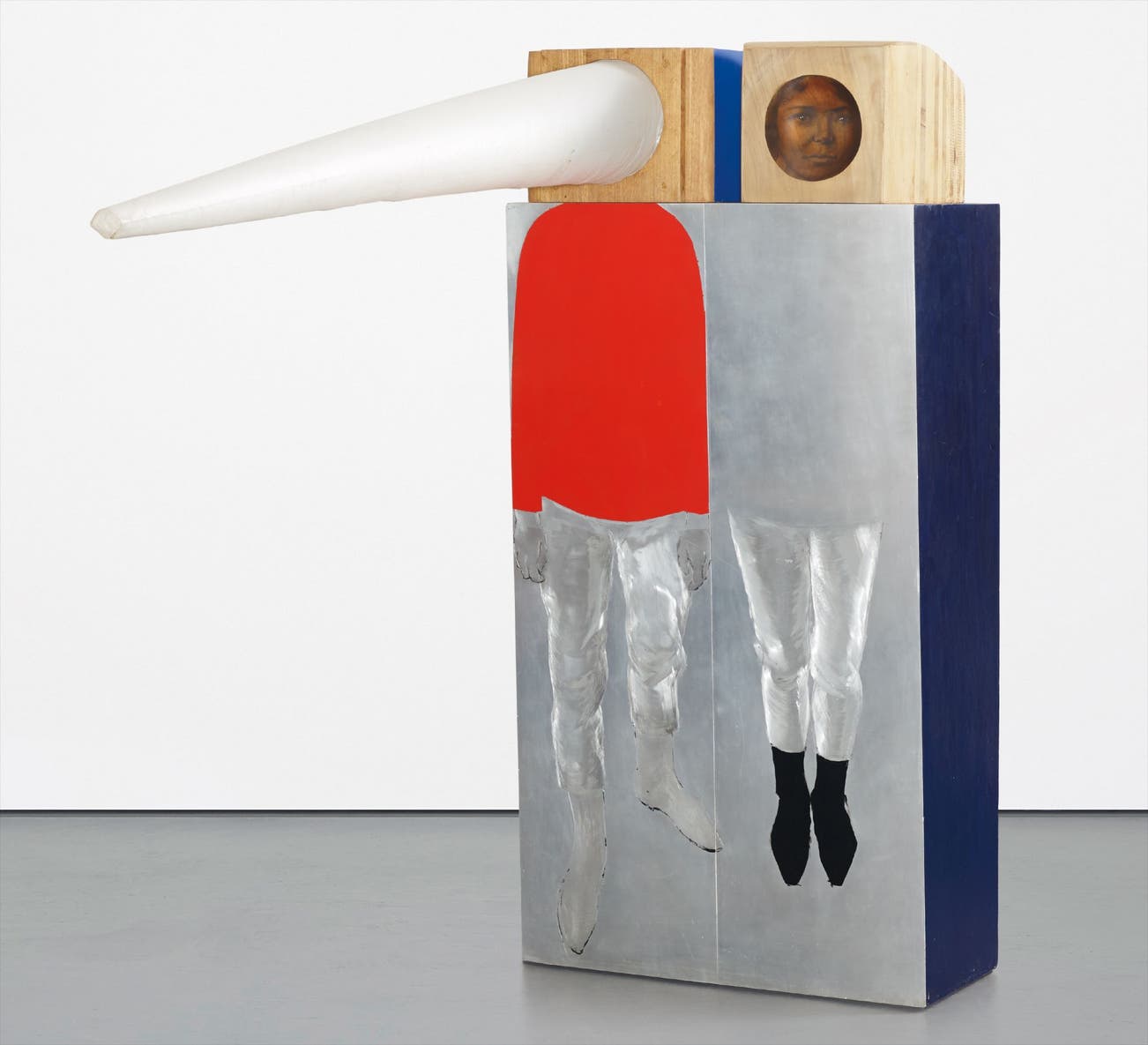 Marisol’s exhibition at Sidney Janis gallery in New York opened in April 1966 to a crowd of over three thousand viewers; the present lot Couple No. 1, 1965-66 greeted audiences immediately upon entering the space. Curator Marina Pacini commented that “visitors stood in line to get in. Marisol surprised and enthralled with works such as Couple No. 1 with its fabric noise jutting out six feet into space thanks to a fan blowing air into it.” Couple No. 1, is comprised of two illustrated figures contained within one wooden column. The left figure, dressed in a bright crimson sweater, matching white pants, white gloves and white boots juts his right foot out towards us, as though he is about to walk right out of the wooden containment and approach us. The figure on the right appears spectral, as though only existing through a pair of floating, white, panted legs with black socks. The masculine figure’s head contains a fan, which when plugged in, blows a continuous stream of air into the white, fabric cone. When activated the white material dramatically extends outwards, centering him with an elongated “nose.” While his red sweater, turned out stance and protruding nose characterize him with an undeniably strong, masculine presence, his counterpart seems to drift, barely visible, her face shrouded within the physical bounds of the wooden block. A delicately rendered face rests within the strict confines of the wood head, in direct contrast to the face of her companion. “Her face, a lifelike rendering in pencil on a concave plate of polished mahogany, betrays vulnerability, and in her expressive dark eyes, extreme sadness. She's obviously trying to put up a good front even as she verges on tears…. it brings to mind the recent study, widely commented on in the media, concluding that women suffer physically when they refrain from expressing themselves in disagreements with their domestic partners.” (C. Diehl, “Eye of the Heart Marisol," Art in America, March 2008, pp. 158-161)