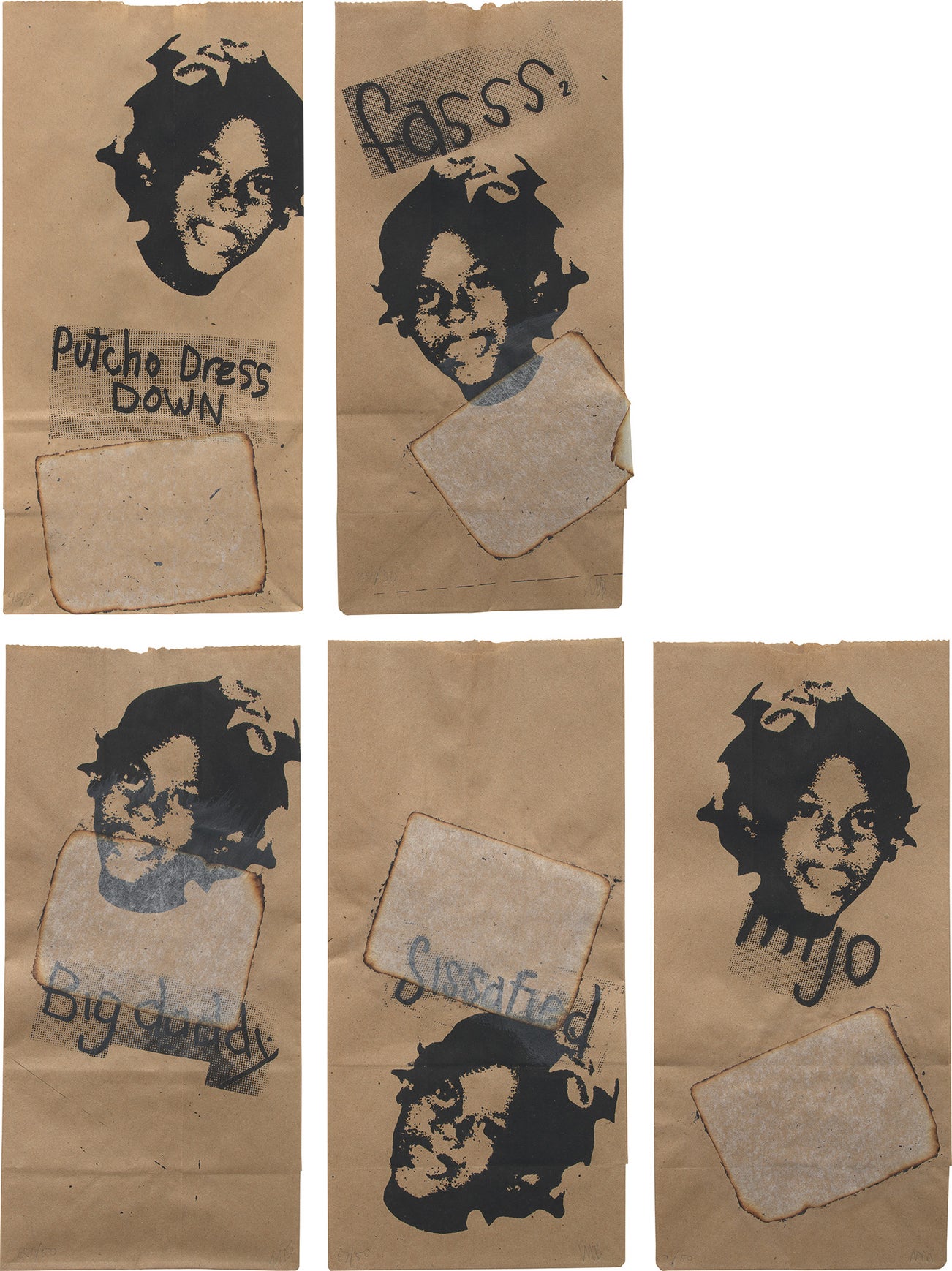 Five unique lithographs with hand applied endpaper, on five brown paper bags.