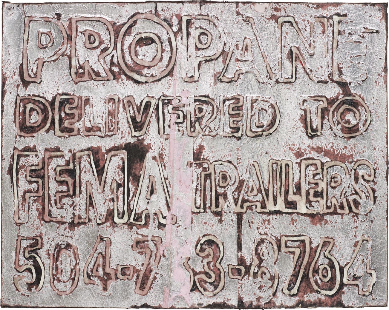 Untitled (Corner of Desire and Piety) III is from a seminal series of Mark Bradford’s “merchant paper” works executed in 2008. Bradford made this series to address Hurricane Katrina’s disastrous effects on the impoverished African American members of the New Orleans community. Included in the acclaimed 2010 Aspen Art Museum exhibition and directly related to the monumental 72-piece 2008 work titled Corner of Desire and Piety at the new Broad Museum in Los Angeles, Untitled (Corner of Desire and Piety) III is a highly charged image of a community still struggling three years after the devastation of Katrina. The pieces of paper in the composition were found in and around the Lower Ninth Ward of New Orleans and advertise propane delivery to FEMA trailers that proliferated, and remained, long after Hurricane Katrina. The corner of Desire and Piety Streets does not exist as the streets run parallel to one another and never intersect. However, Bradford uses the title of the work as a metaphoric incongruity that mirrors the impossible decisions many residents were forced to make following Katrina and its recovery period. Utilizing shimmering foil further obscures the text and pushes the physical manifestation of language away from the literal and towards abstraction. Within such a compact composition, the artist is able to unite many of his primary stylistic and emotional themes that are interwoven throughout his practice. Without regard to the source of his materials, Bradford’s work is always focused towards social commentary and, through his art, advocacy. Incorporating the ephemera of his “neighborhoods” across America in his minimalist text “paintings”, Mark Bradford makes us aware of the exceptional ways in which he has been able to re-examine and then re-purpose the practice of painting in the 21st century.