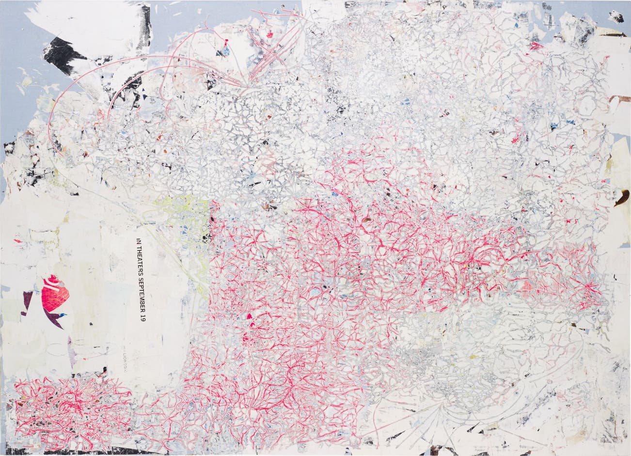 Mark Bradford’s 2012 Building "The Big White Whale" is a stunning composition in both collaged and decollaged mixed media on canvas. At the same time, it is a totally immersive example of how Bradford works. A bold and massive affirmation of Bradford’s painting, and of contemporary painting itself, Building "The Big White Whale" is a deeply engaging expanse of tangled pinks, greys, and greens. It offers enveloping swaths of white and blue; juxtaposed text; and the sometimes veiled, sometimes unveiled nature of the artist’s found media in the work’s complex materiality. Growing up in Los Angeles, in the fraught neighborhood of South Central LA, and working in his mother’s hair salon, Bradford gained an intimate and intense knowledge of both the positive and harsh, human and geographic aspects of his environment, an environment whose presence is intensely felt and seen throughout his work.