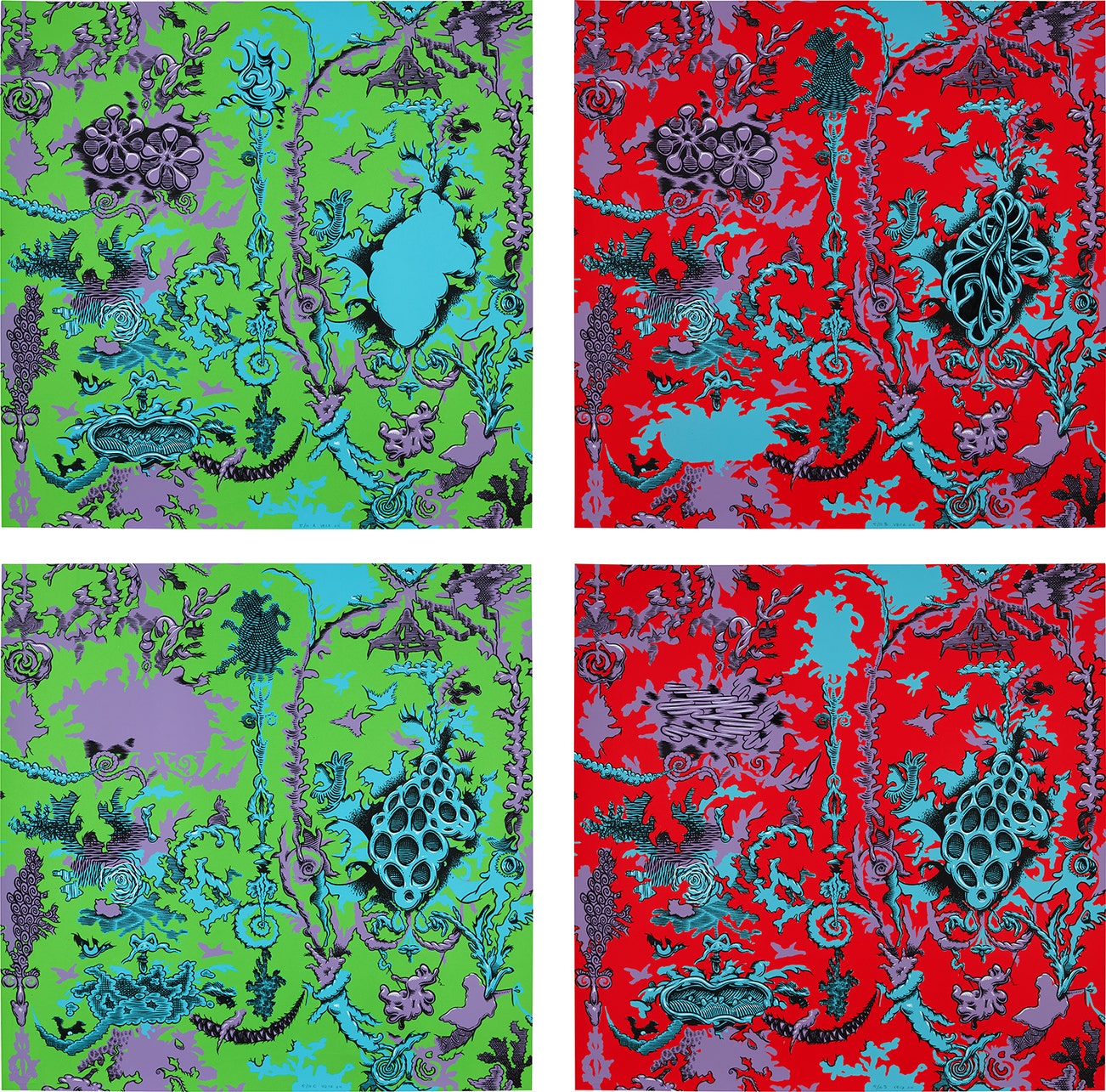 The complete set of four screenprints in colors with hand-coloring, on Arches paper, the full sheets.