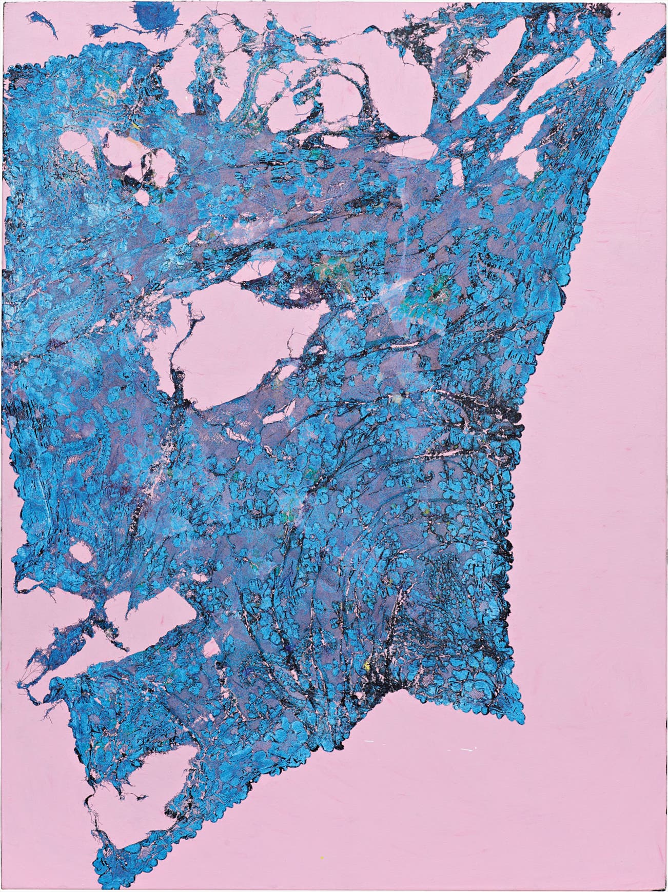 placed and removed an electric blue pigment-soaked filigree, upon a bubblegum pink monochrome background, revelling in the importance