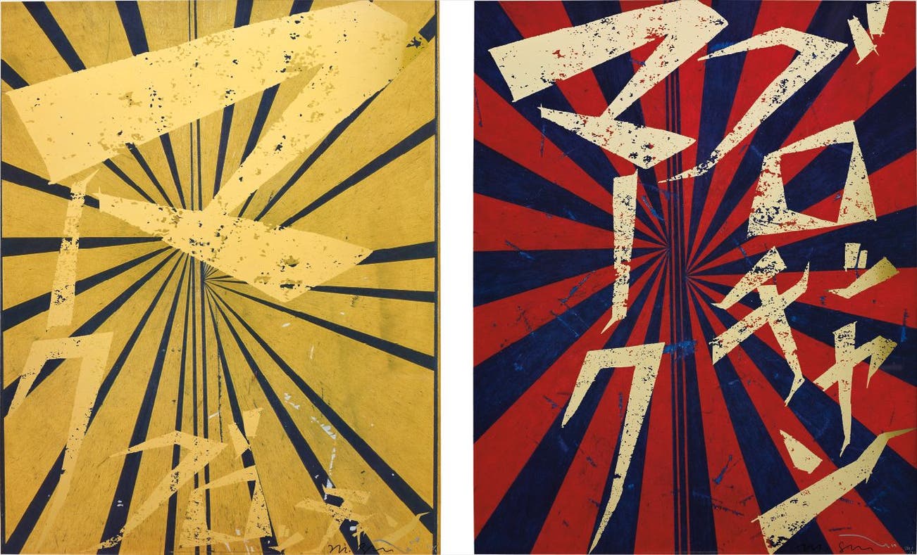 Both signed (Mark Grotjahn in black ink and Takashi Murakami in silver ink) and numbered 130/300 and 121/300 in silver ink, published by Kaikai Kiki, Co., Ltd., Tokyo, both framed.
