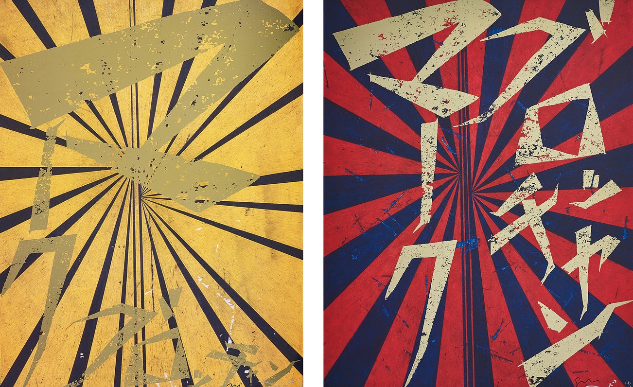 Each signed by both artists (Mark Grotjahn in black ink and Takashi Murakami in silver ink) and numbered 129/300 and 118/300 respectively in silver ink, published by Kaikai Kiki, Co., Ltd., Tokyo, both framed.