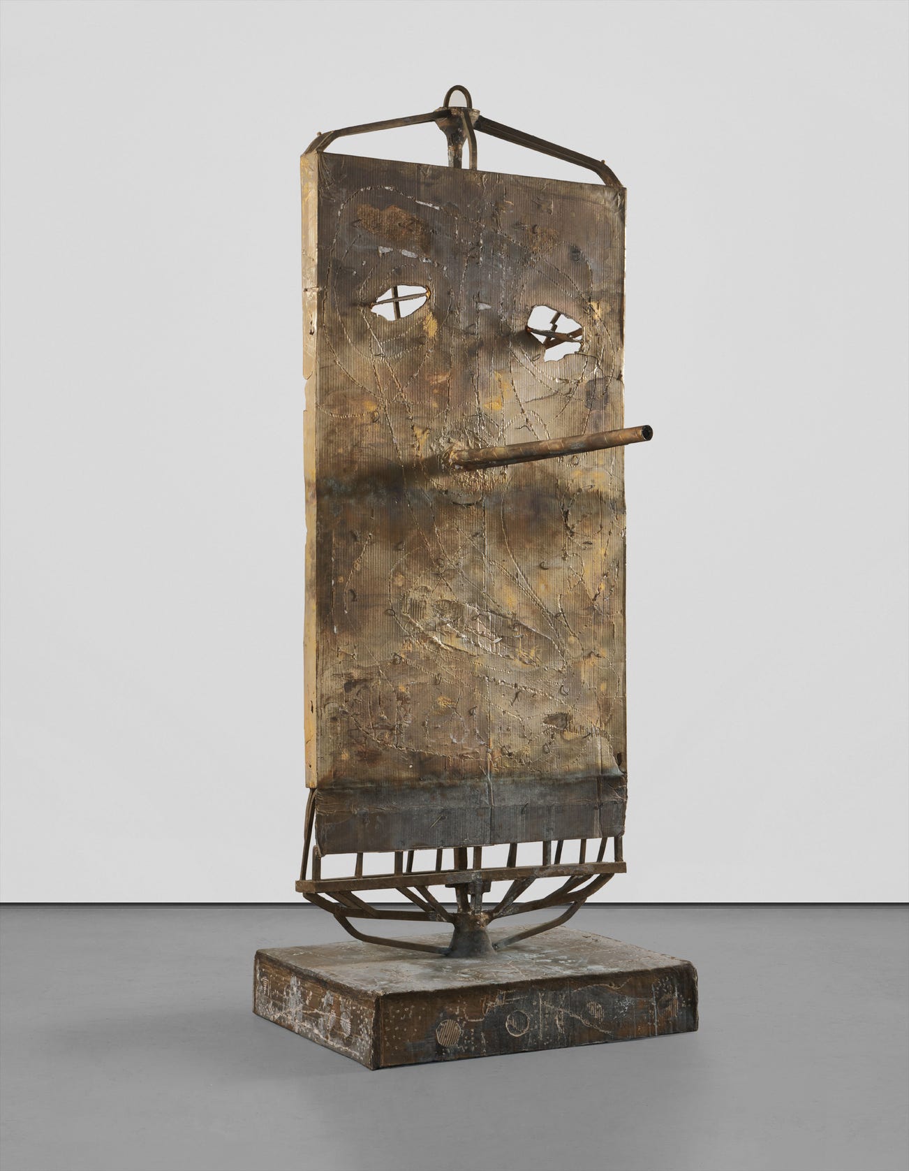 Evoking the naive mysticism of Paul Klee, the Masks stem from an essential, and deeply personal, aesthetic urge. Seeking an escape from the meticulously regulated construction of perspective when working on the Butterfly paintings, Grotjahn began making playful masks from the cardboard waste of supply boxes and beer cartons around his studio. Cutting and scratching into the surface, he would apply toilet rolls to create absurd nasal forms, all as a way of unwinding and finding pleasure in the art of construction. The cardboard masks offered him a chance to “get dirty and messy, to be expressive in a different way” (Mark Grotjahn, quoted in Jori Finkel, “Mark Grotjahn’s New Work”, The New York Times, May 7, 2014, online). Here the dents, tears and perforation of cardboard provide a visual map of the artist’s creative mind – the fusion of the psychological and the physical, and an insight into a self-affirming vision intended only for his own gaze. As the artist recounts, “I kept them private for 13, 14 years. I gave them away to friends or occasionally traded one. At a certain moment, I wanted to do a show with them. When you cast them in bronze they become different. In a way, I depersonalized them; they feel less as a diary and are more an armature for a painting” (Mark Grotjahn, quoted in Marta Gnyp, “Mark Grotjahn”, Zoo Magazine, no. 38, January 2001, online)