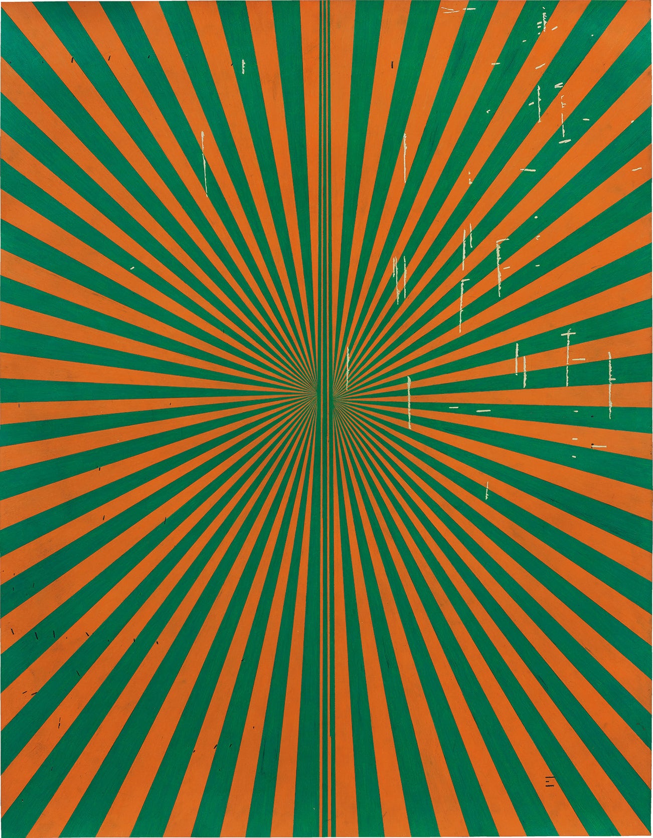 Comprising the artist’s trademark asymmetric - yet alluringly anthropomorphic - pattern, Grotjahn’s Butterfly drawings emerged from an earlier series of three-tiered perspective canvases, which explored the hypnotic effects induced by the collision of multiple vanishing points on a single horizontal plane. In his Butterfly works, Grotjahn shifts the axes laterally, complicating the potential boundaries of perspective: ‘The butterfly came because I tried to make some horizontal three-tier perspectives; […] I made the first two tiers vertical and I pointed the perspectives towards each other…It certainly became more a painting and less a representation’ (Mark Grotjahn, in conversation with Marta Gynp, ‘Mark Grotjahn’, Zoo Magazine, no. 38, January 2013, online). Emulating the eponymous insect’s delicate, cantilevered wings – designated by green and orange striations – as if they were spreading wide and rectilinearly towards the four edges of the canvas, Untitled (Orange and Grass Green Butterfly 45.02) retains a dominant vertical vanishing point at the centre of the drawing to form the Butterfly’s skeleton. The viewer, directly included in this vertiginous experience, is made to dream and travel beyond the surface of the image, propulsed in a visual vortex that eludes the external world’s functioning parameters of space and time.